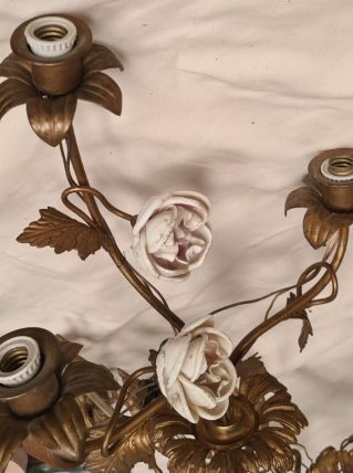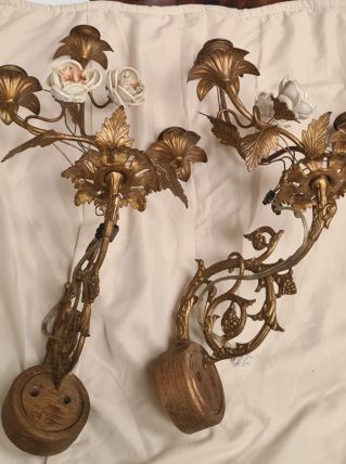 paire d applique murale laiton bronze 1900 a 30 rose porcelaine45x28 elec complete a voir , superbe produit d epoque