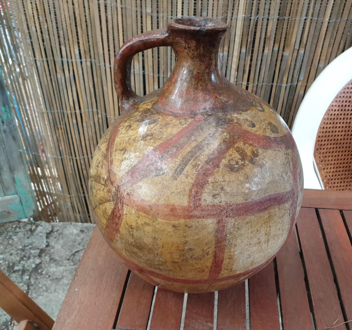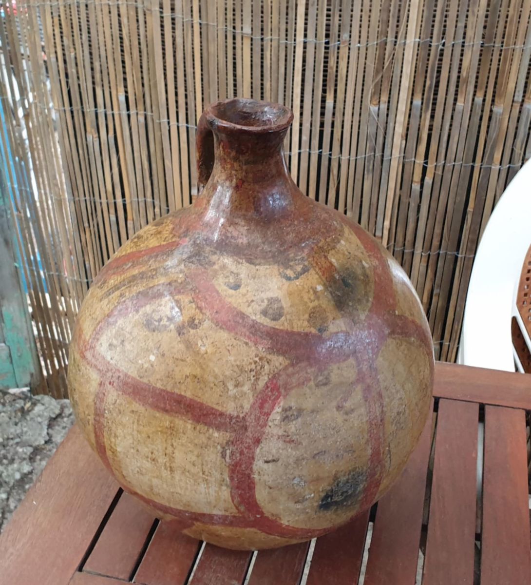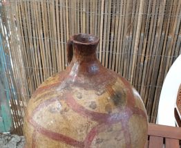 Description :jarre à col et anse comportant un décor peint de traits larges rouge sombre sur la panse