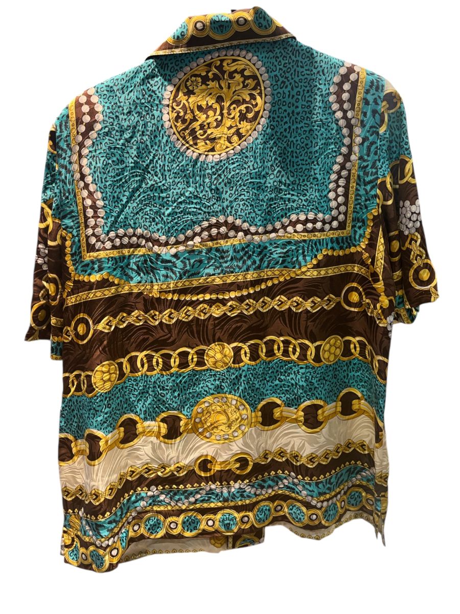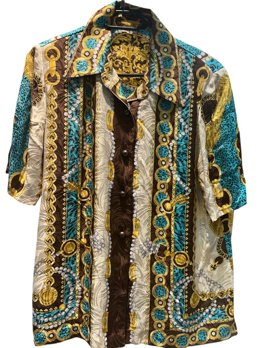 Chemise manche courte à motifs baroque en marron doré, bleu ciel vintage
