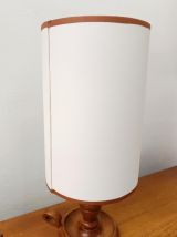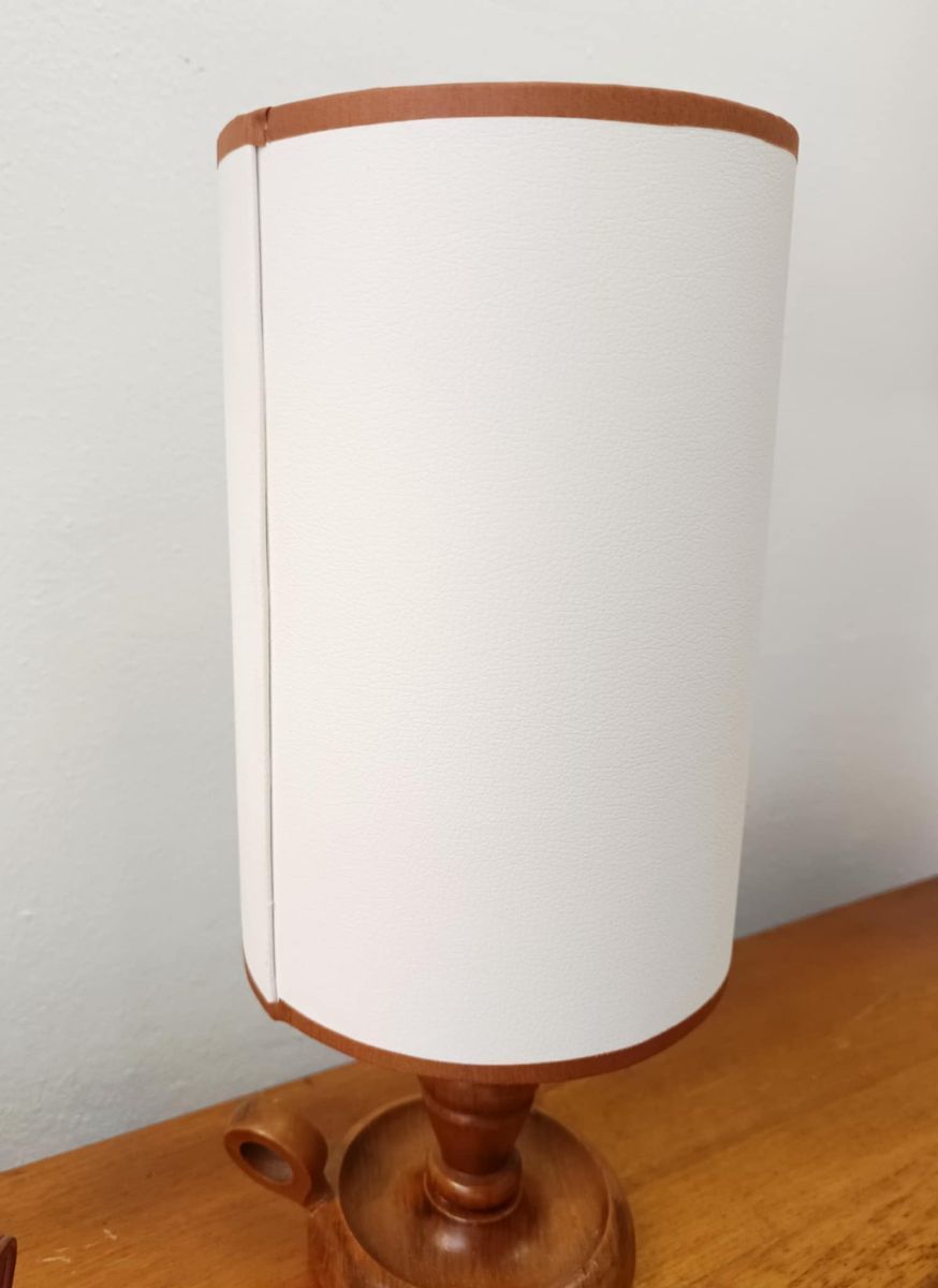 Abat-jour de forme cylindrique en simili-cuir blanc à bordure marron réalisé sur mesure.