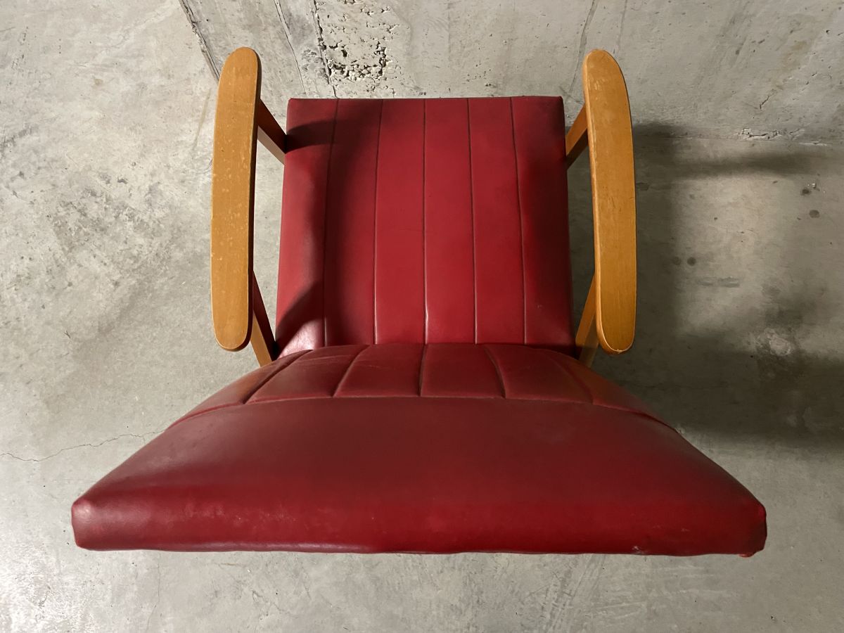 Fauteuil scandinave type boomerang des années 50 en bois de hêtre et skaï rouge, traces d’usure et déchirures sur le revêtement, structure très saine, hauteur 82cm, hauteur assise 34cm, assise 50x50cm, dimensions totales (cm) : L.62xH.82xP.70.