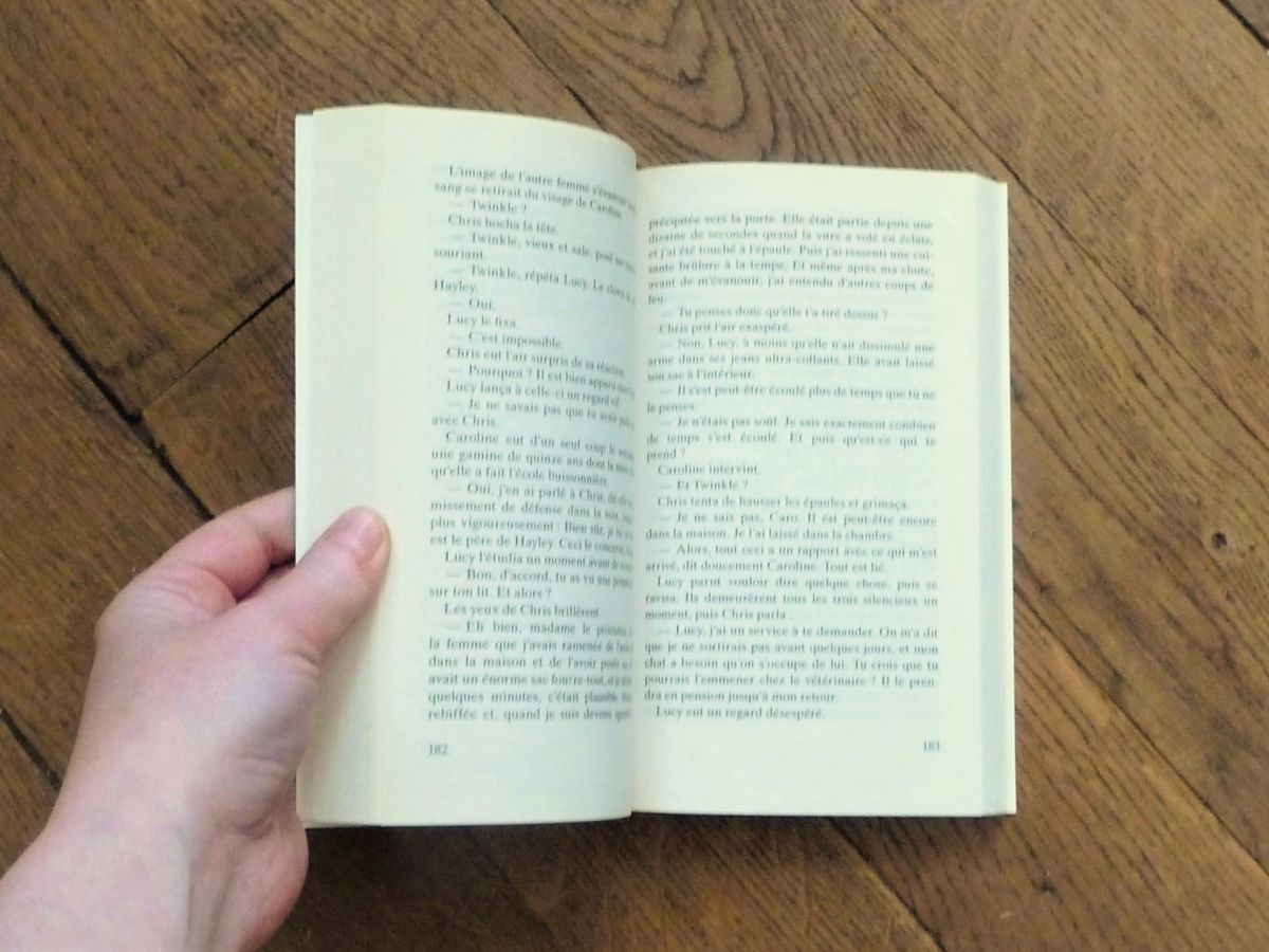 «Un cri discordant, semblable à celui d'un animal, déchira le calme de la pénombre. L'homme blêmit, tourna vivement la tête sur la gauche et baissa les bras. La balançoire le percuta violemment à l'estomac et le renversa. L'impact projeta la petite fille en avant. Elle tomba à quatre pattes et se traîna vers l'homme.