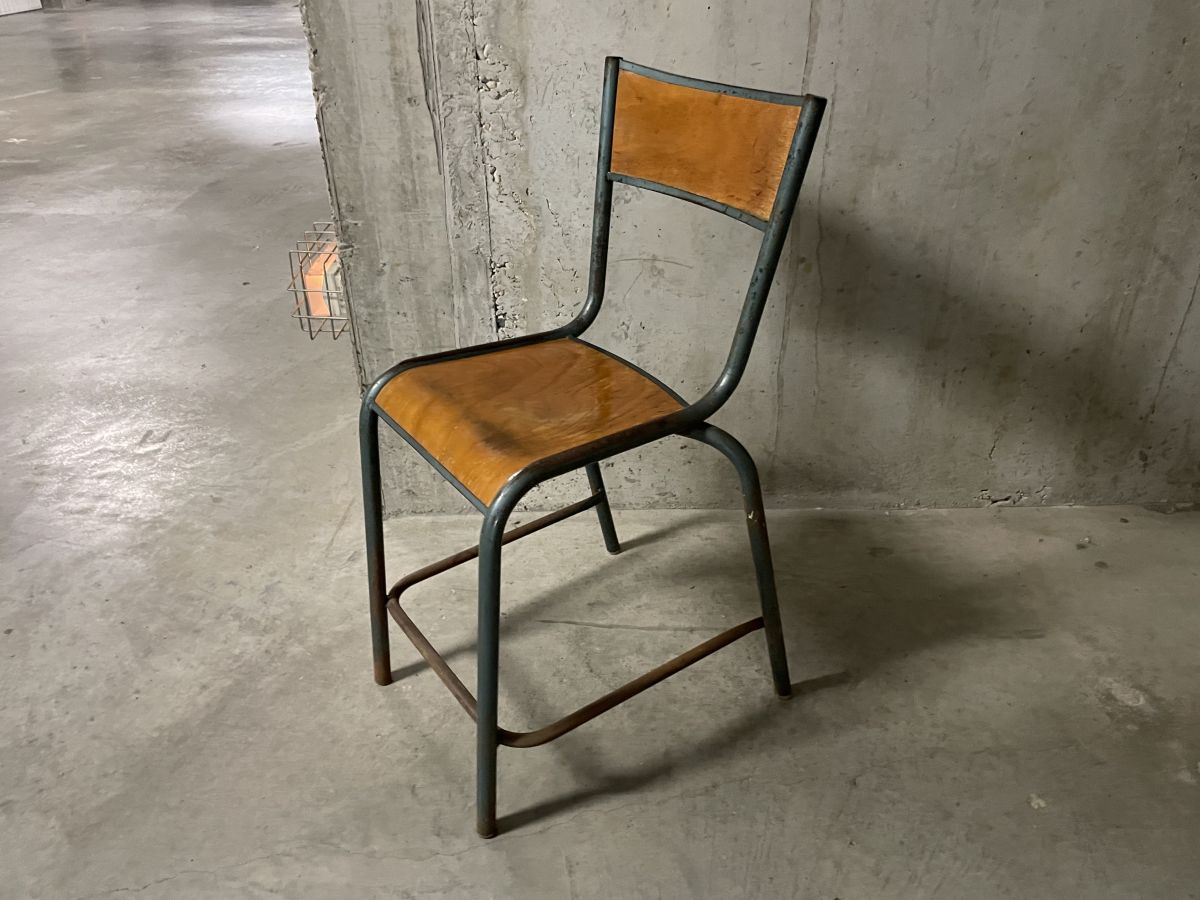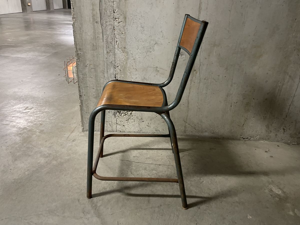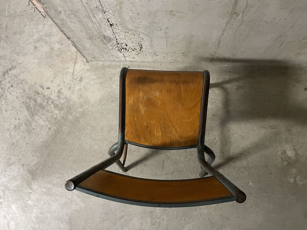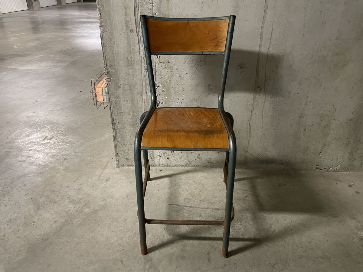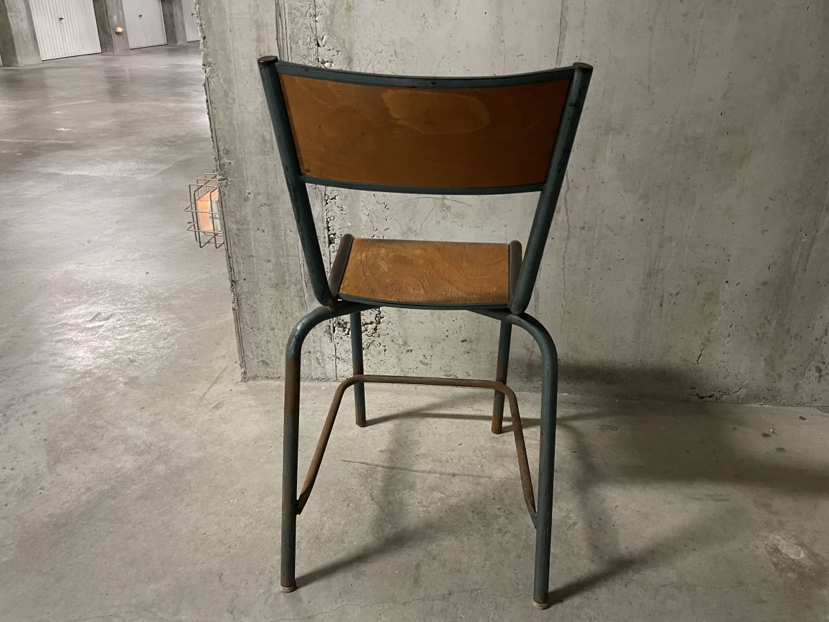 Chaise de laboratoire Mullca en métal et bois, superbe patine miel du bois, structure tubulaire bleu brillant, rouille et manques lui conférant tout son charme et son vécu, hauteur 87cm, hauteur assise 53cm, assise 35x32xm, dimensions totales (cm) : L.47xH.87xP.52