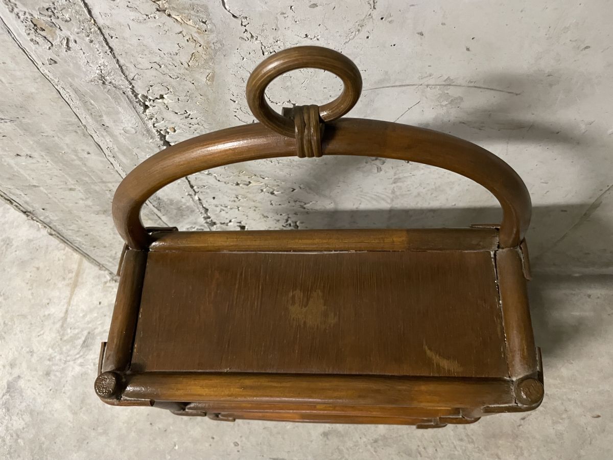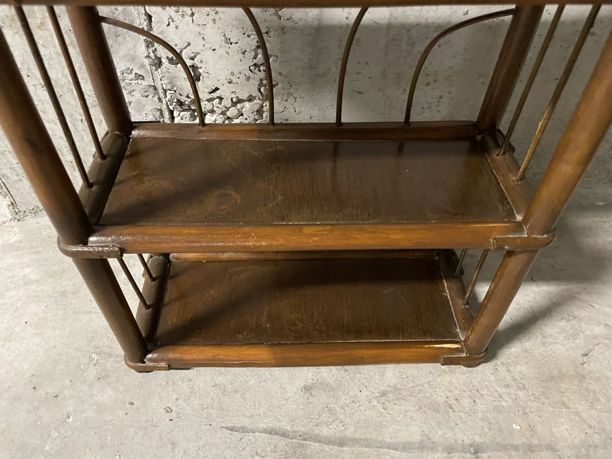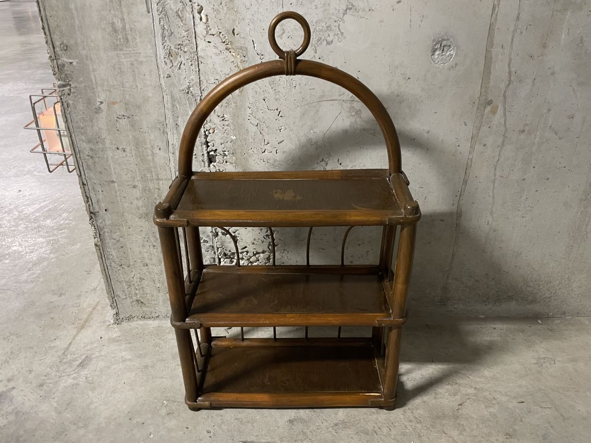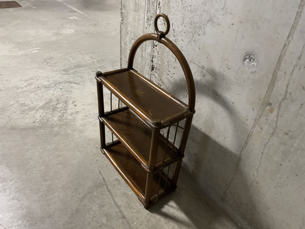 Petite étagère à épices en rotin et bois des années 70, dimensions (cm) : L.41xH.69xP.18, bon état.