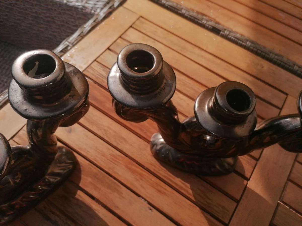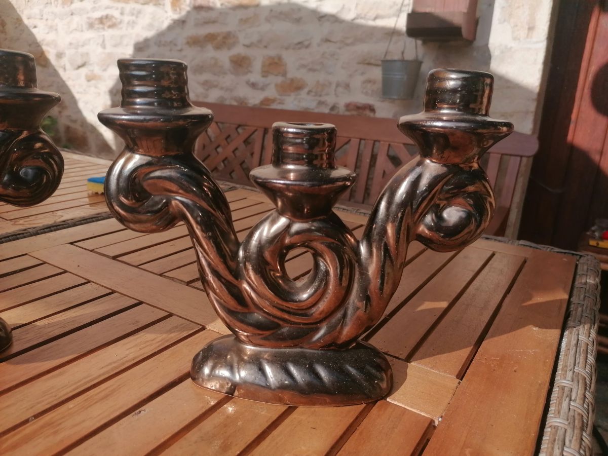 Paire de bougeoirs /chandeliers signés Vallauris (voir dernière photo), en céramique noire effet métallisé, s'accorde aussi bien avec un intérieur classique que sur un beau buffet moderne