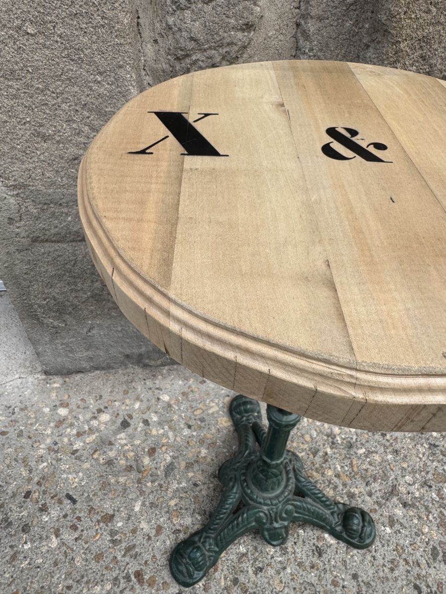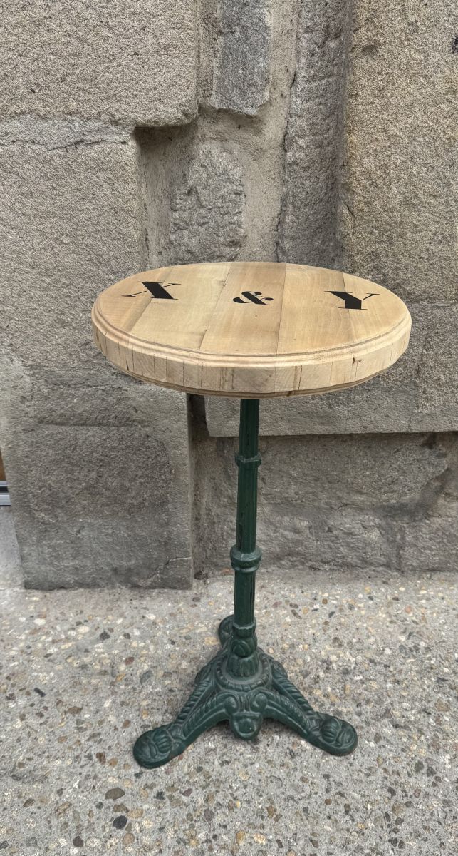 Table guéridon pied fonte couleur vert anglais. 39 cm de large et 74 cm de haut.