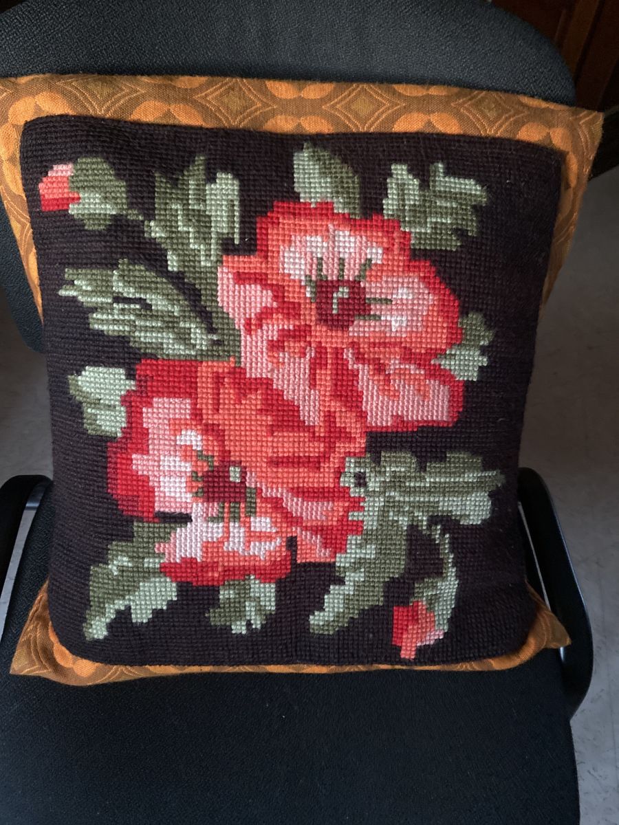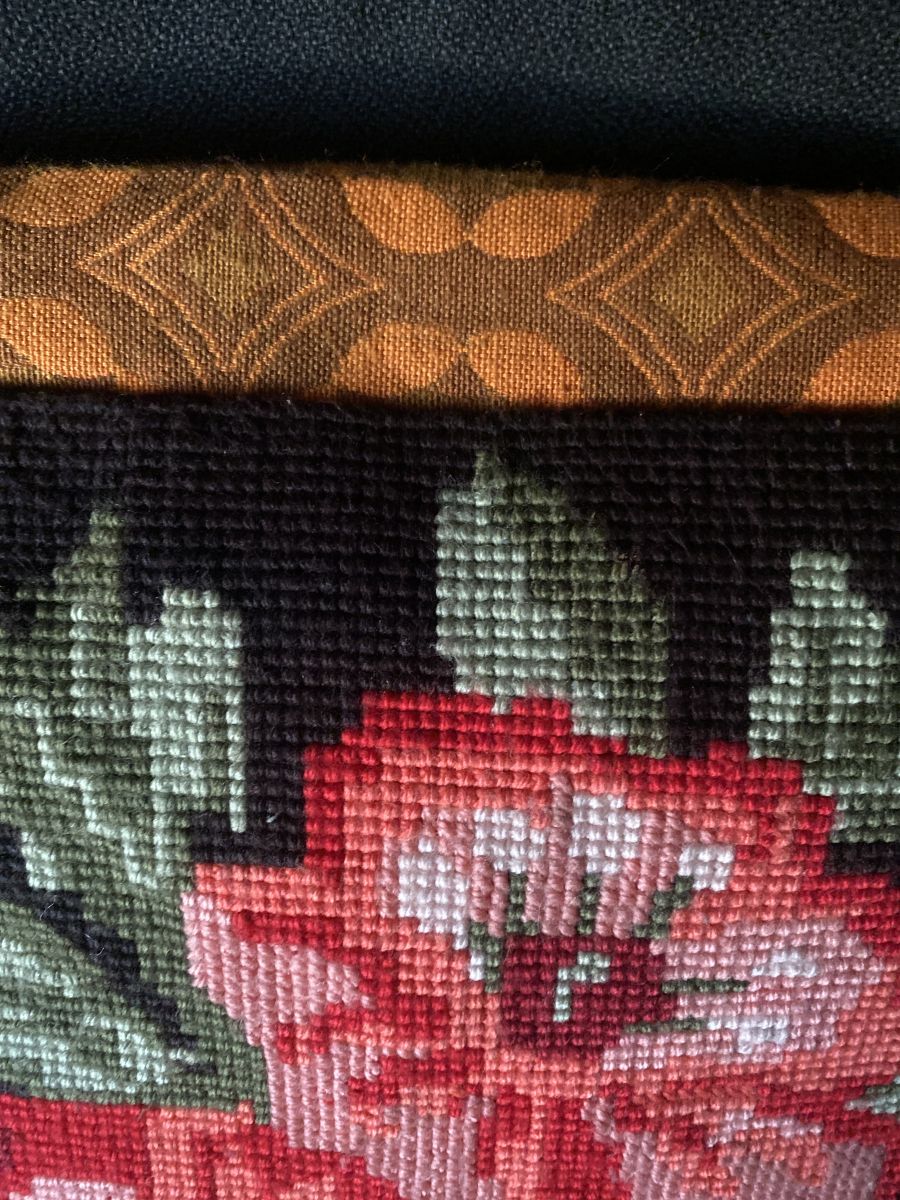 Superbe housse de coussin typique des années 70, réalisée à partir d’un canevas épais de belle qualité avec Son motif floral richement détaillé met en valeur de magnifiques roses en fleurs, et ce sur un tissus des années 70 aux coloris et motifs géométriques typiques orangée