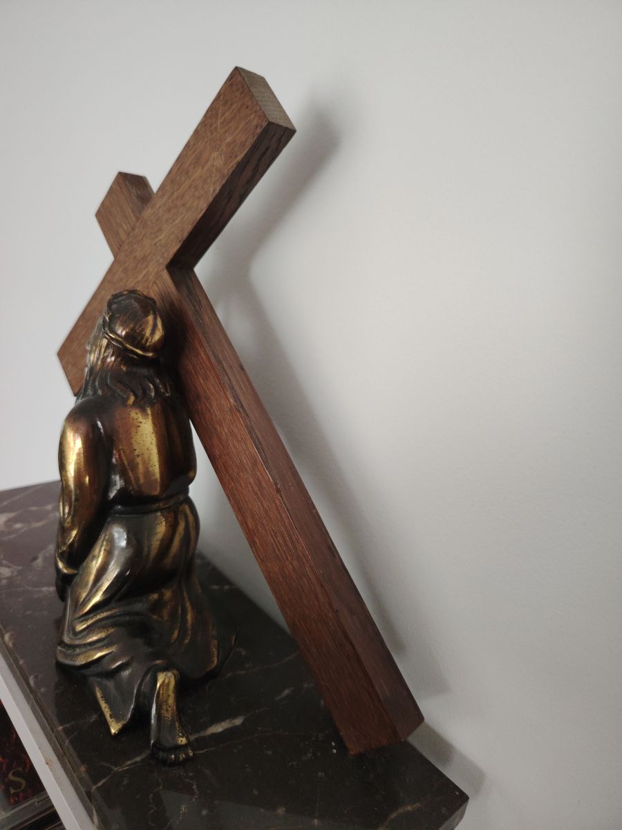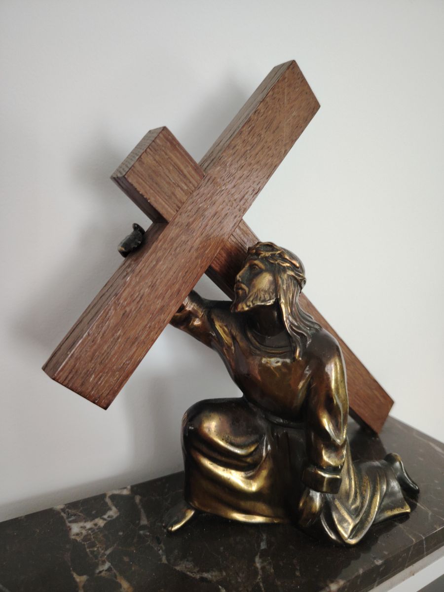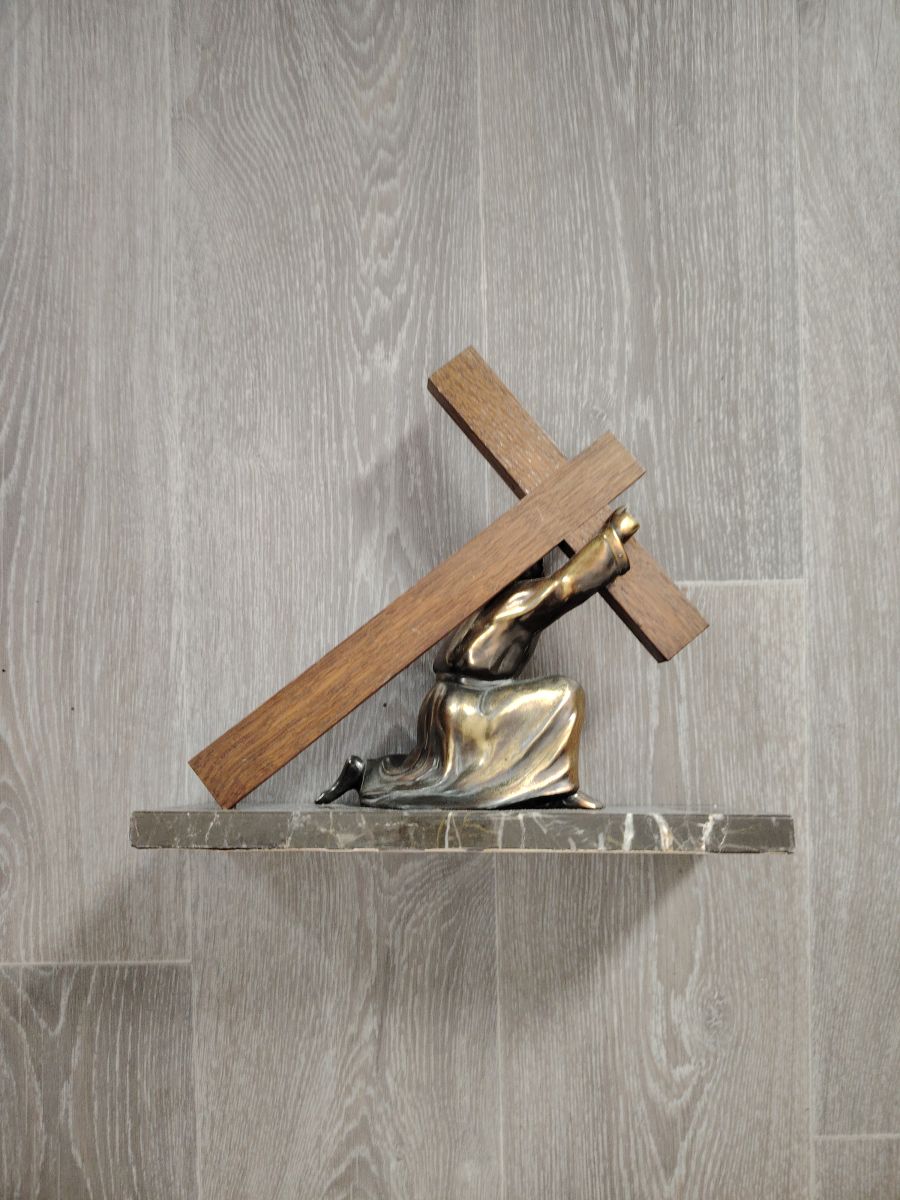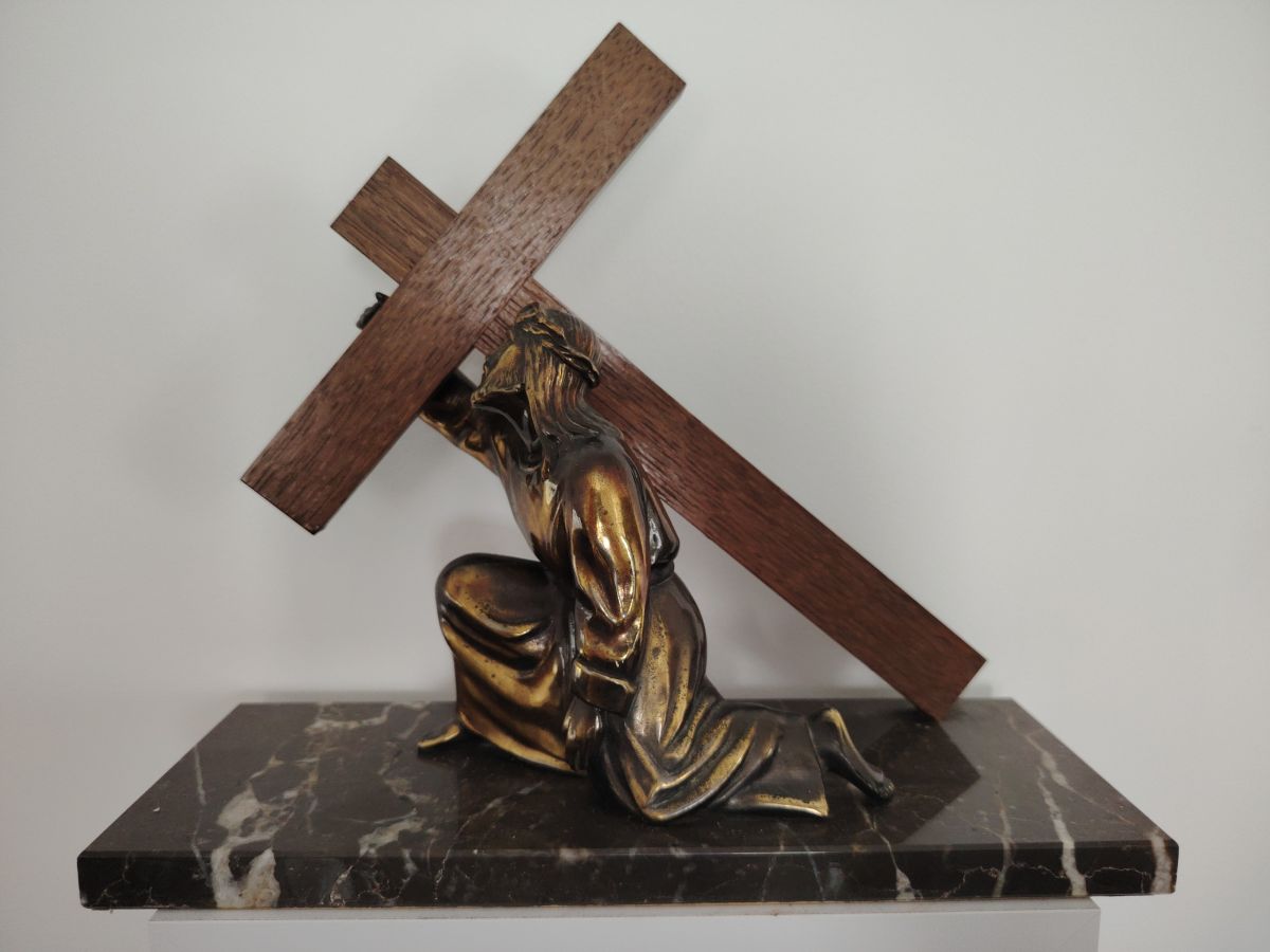 Belle statuette en régule sur un socle en marbre avec comme sujet Jésus-Christ portant sa croix en bois.