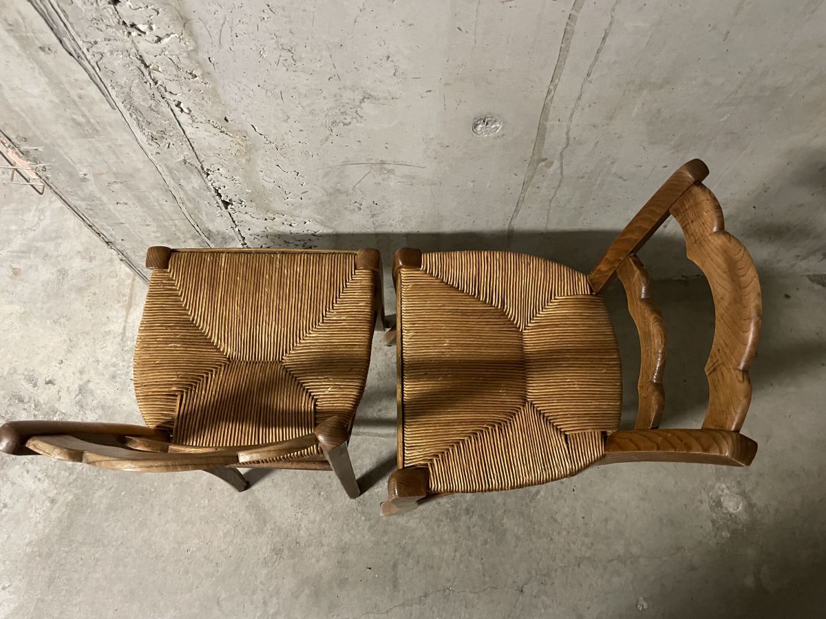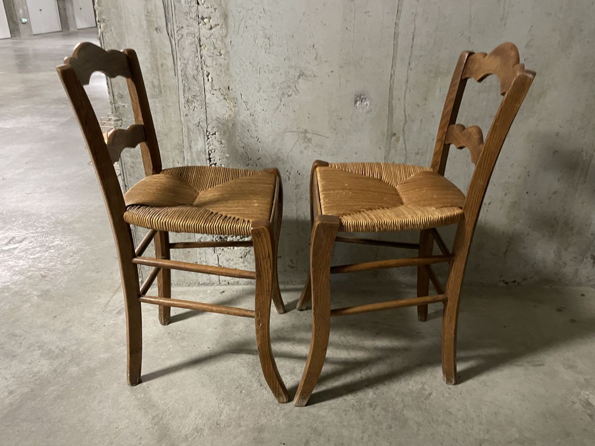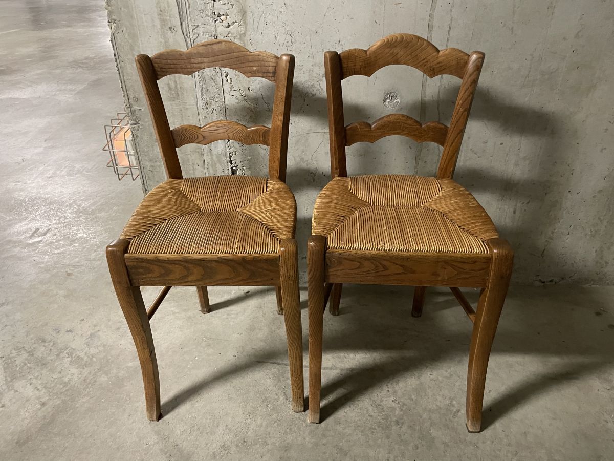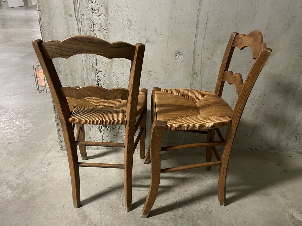 Paire de chaises paillées de style provençal en bois de chêne, légère différence de taille (quasiment invisible à l’oeil nu), hauteur de la plus grande 80cm, assise 37x34cm, hauteur assise 47cm, hauteur de l’autre 78cm, assise 35x33cm, hauteur assise 46cm, bon état.