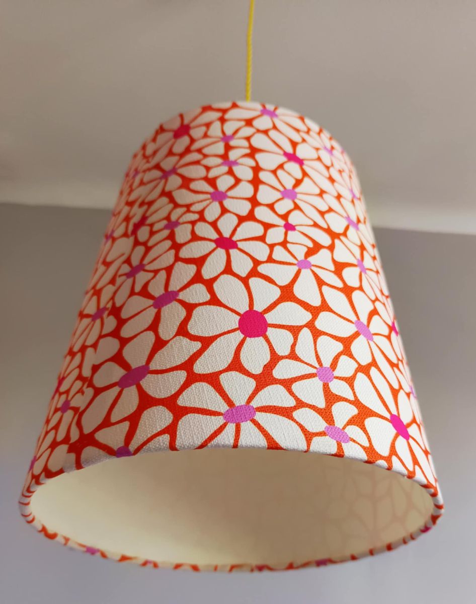 Suspension vintage style 1970 composée d'un abat-jour cylindrique réalisé sur mesure avec un tissu orange à grosses fleurs. A été montée a l'électricité avec une douille blanche E27, un fil électrique en tissu torsadé jaune vif et un pavillon en plastique blanc afin de cacher le branchement.