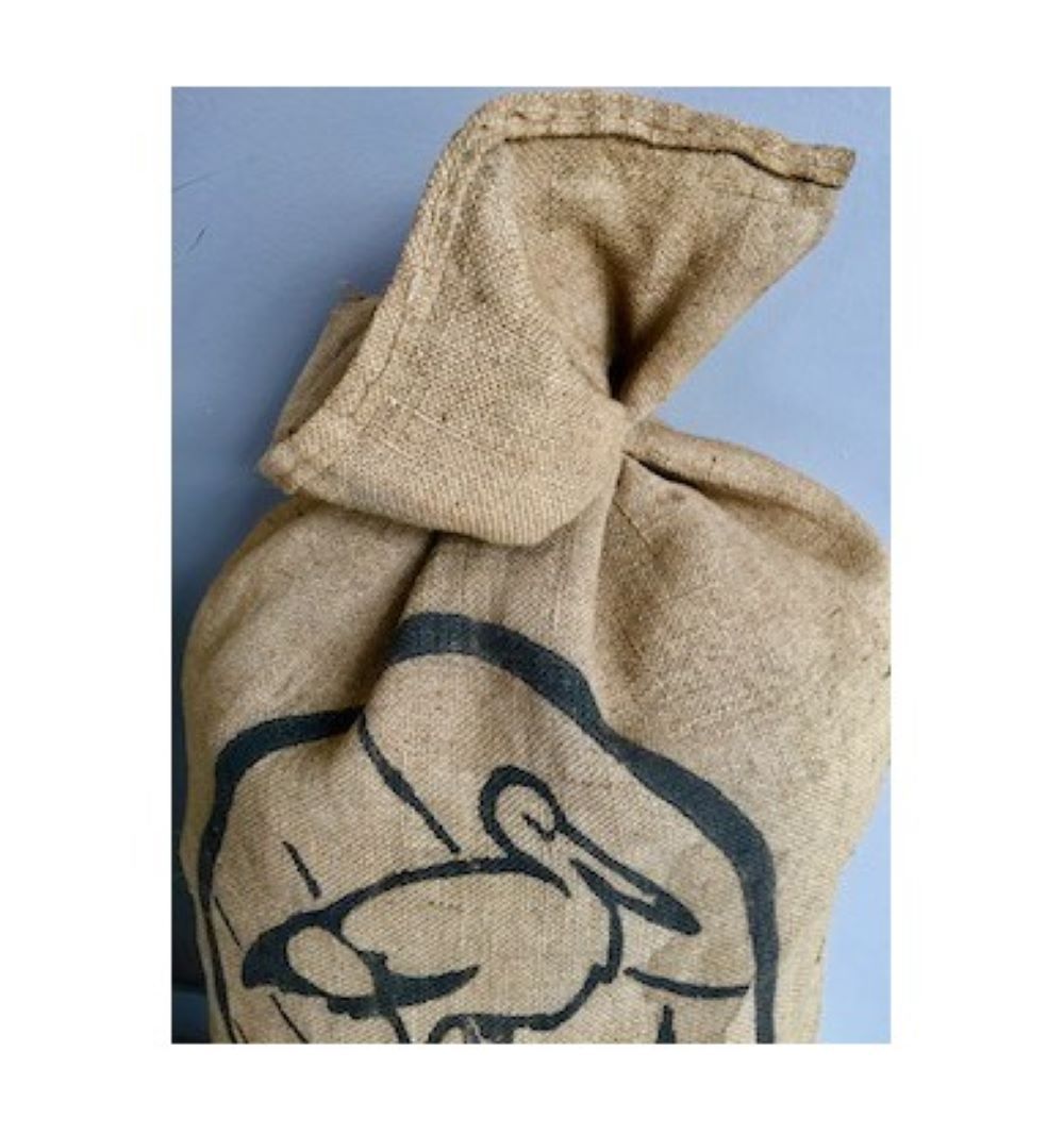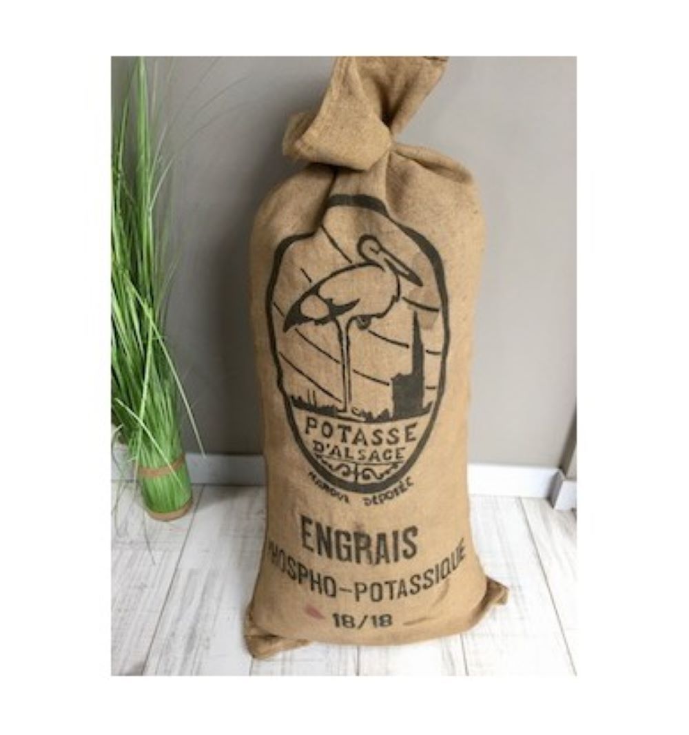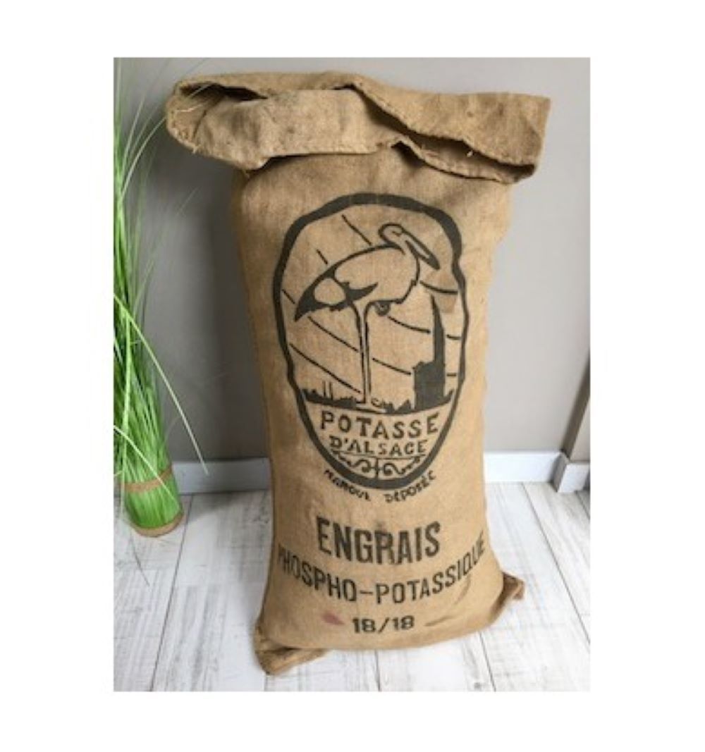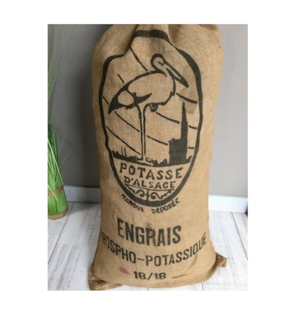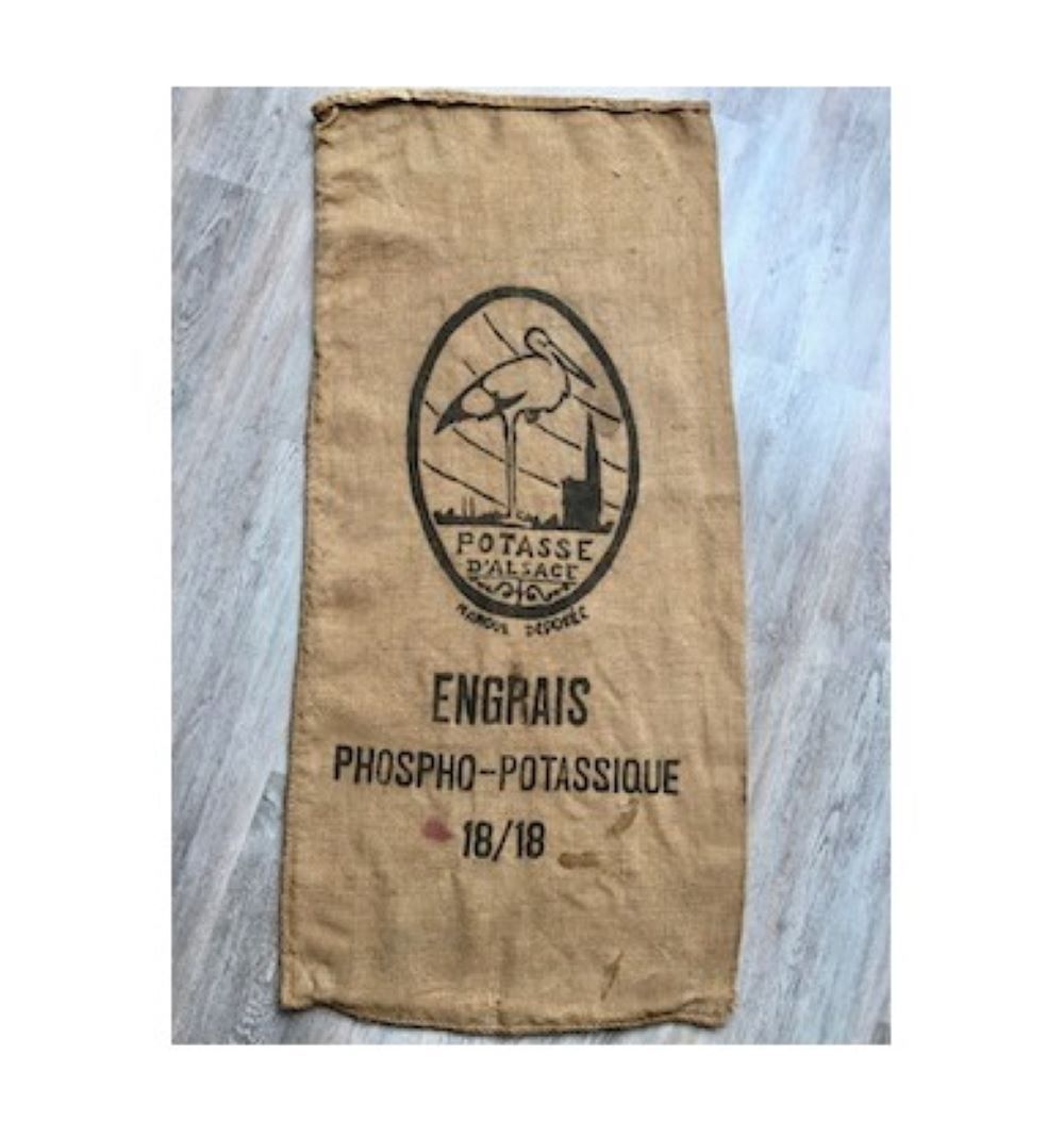 Ancien sac de chanvre pour le transport de la potasse extraite des mines d'alsace, qui était livrée aux acheteurs agricoles afin de fertiliser leur sol.