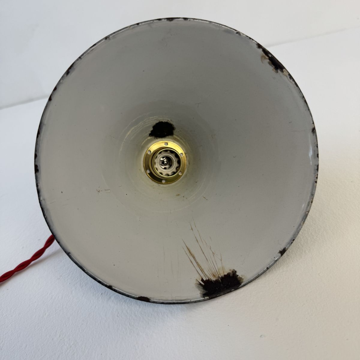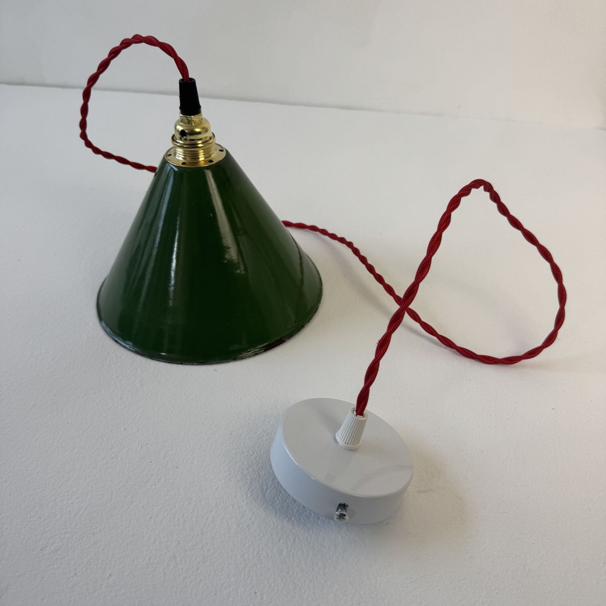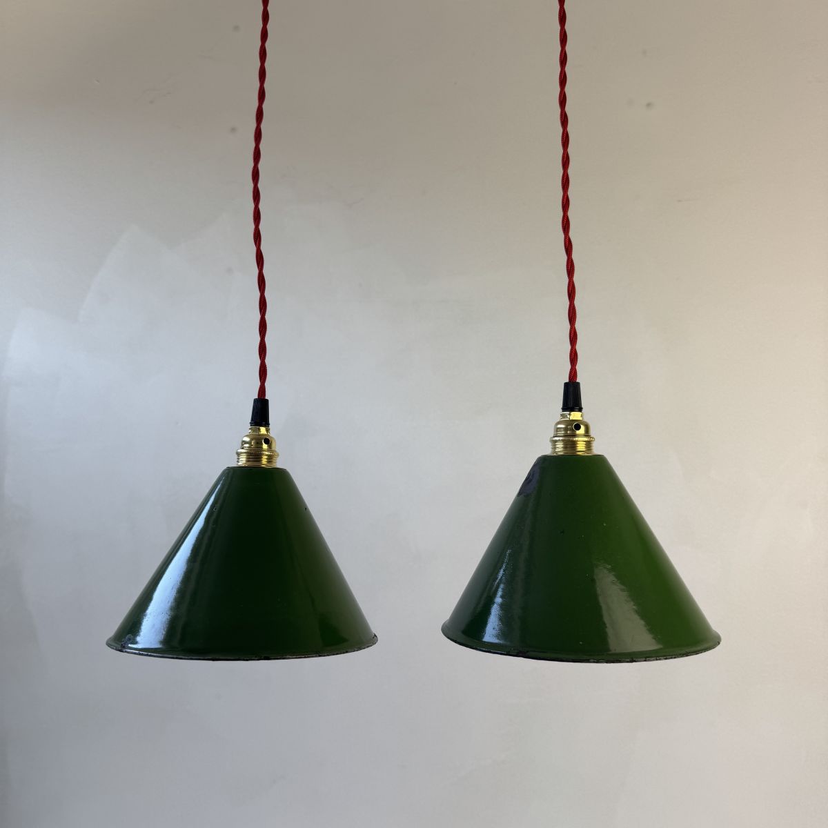 Paire de 2 anciennes suspensions d’usine en tôle émaillée verte. A noter des sauts d’émail, des traces de rouilles et impacts (voir photos)