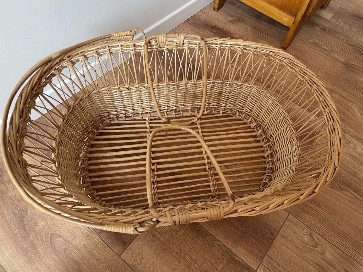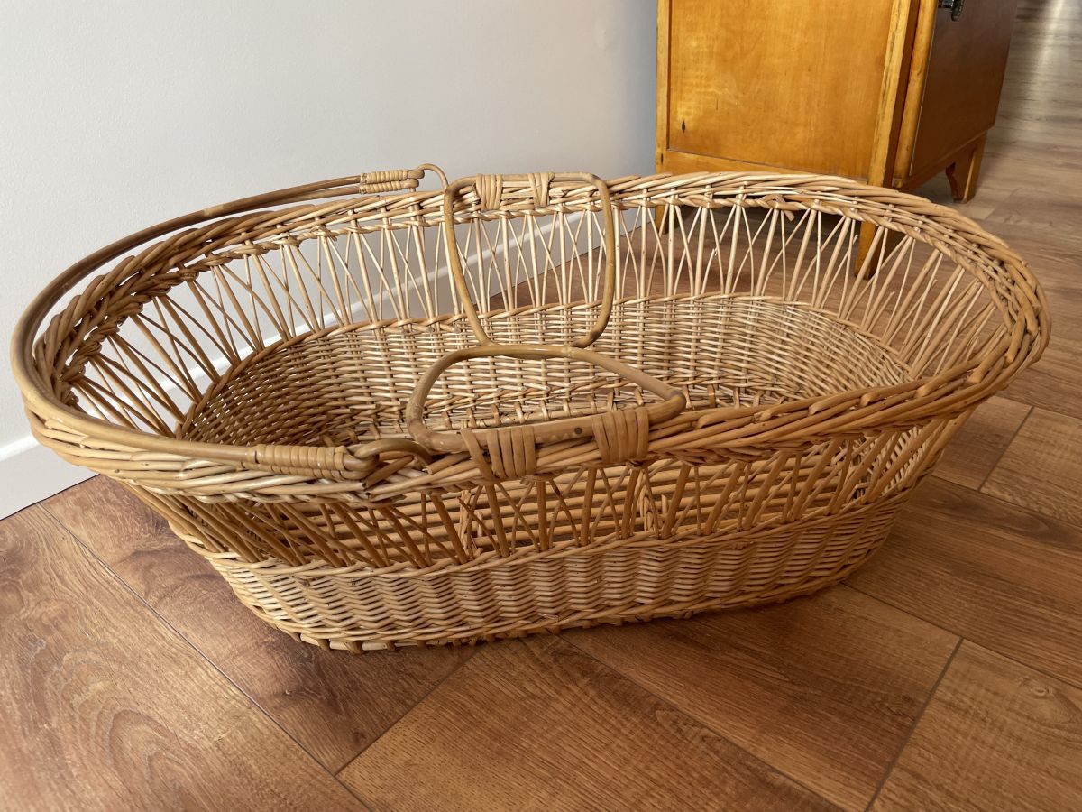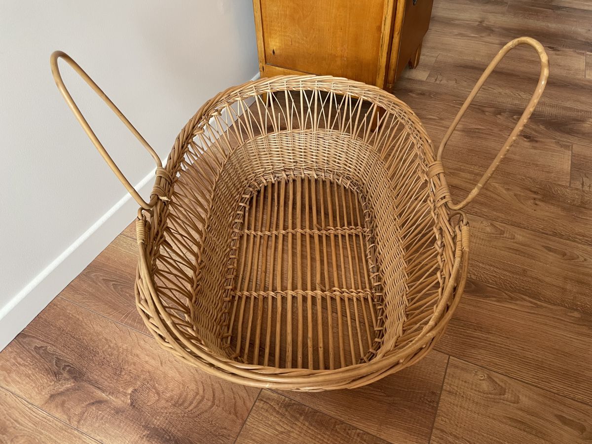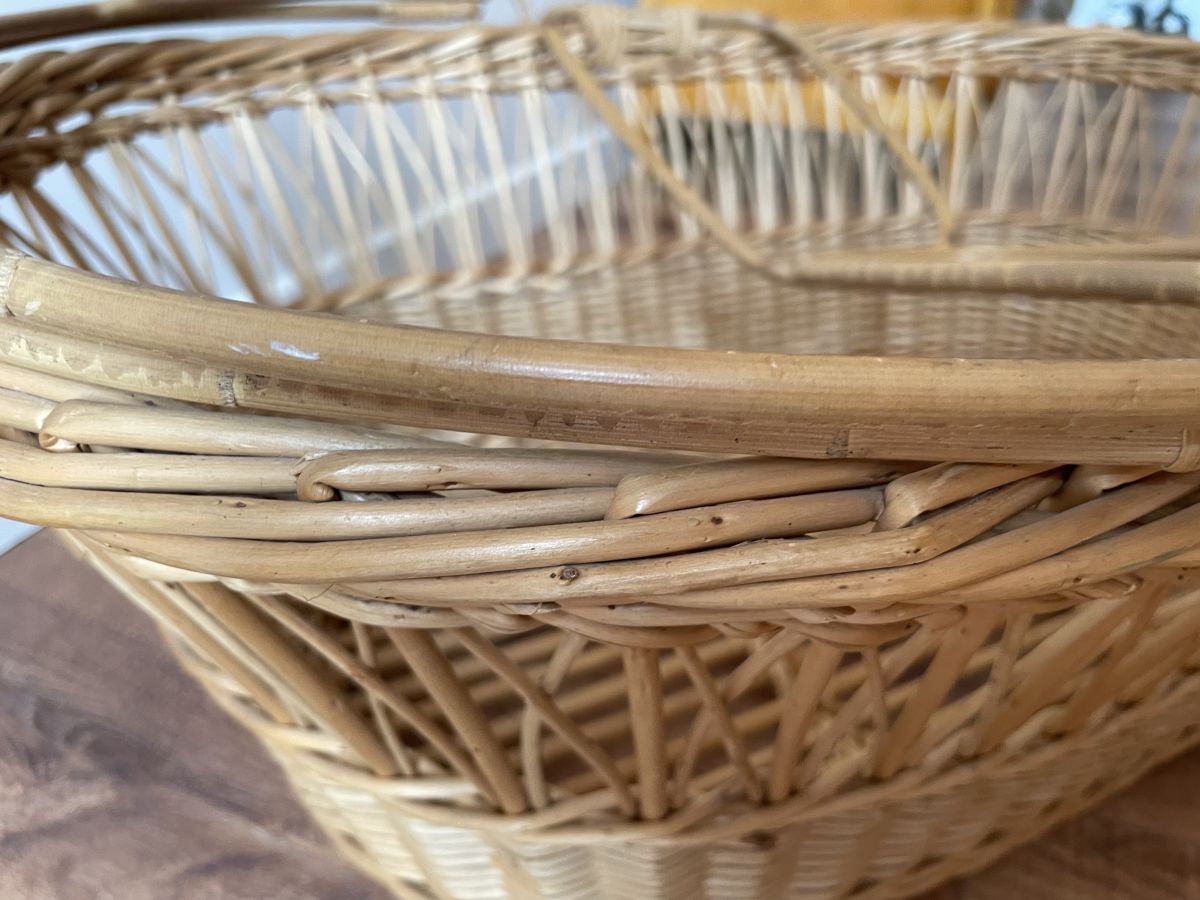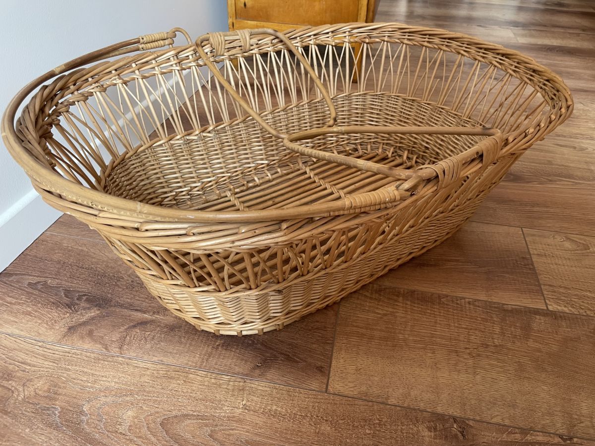 Couffin en rotin et osier des années 60, quelques manques de brins sur le tour (voir photos) absolument sans conséquence, peut servir de panière de rangement ou de présentation, dimensions (cm) : L.120xH.84xP.60.