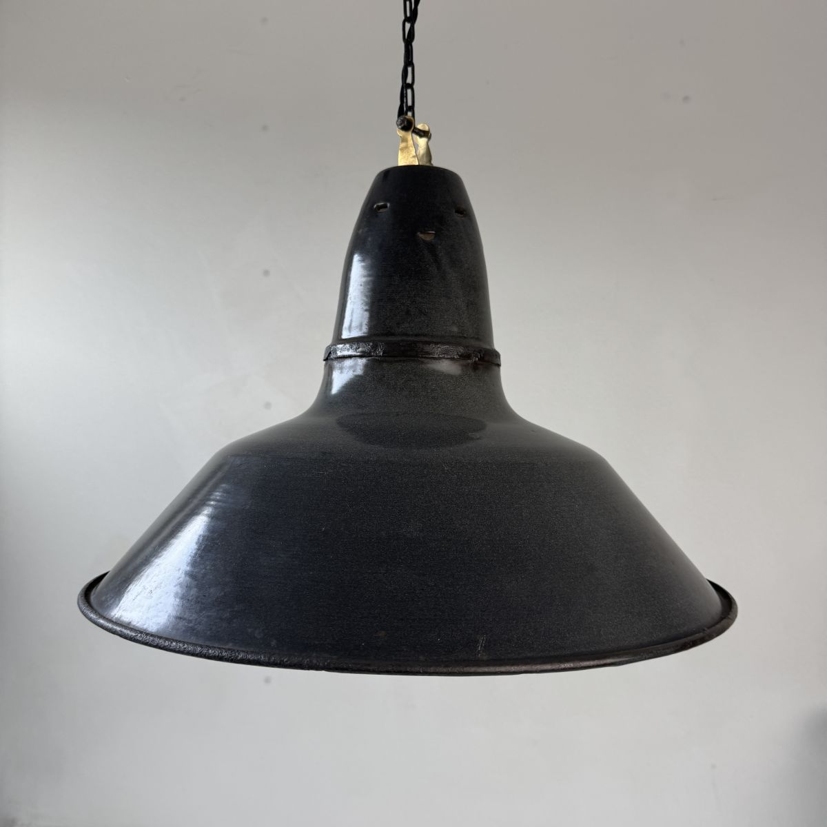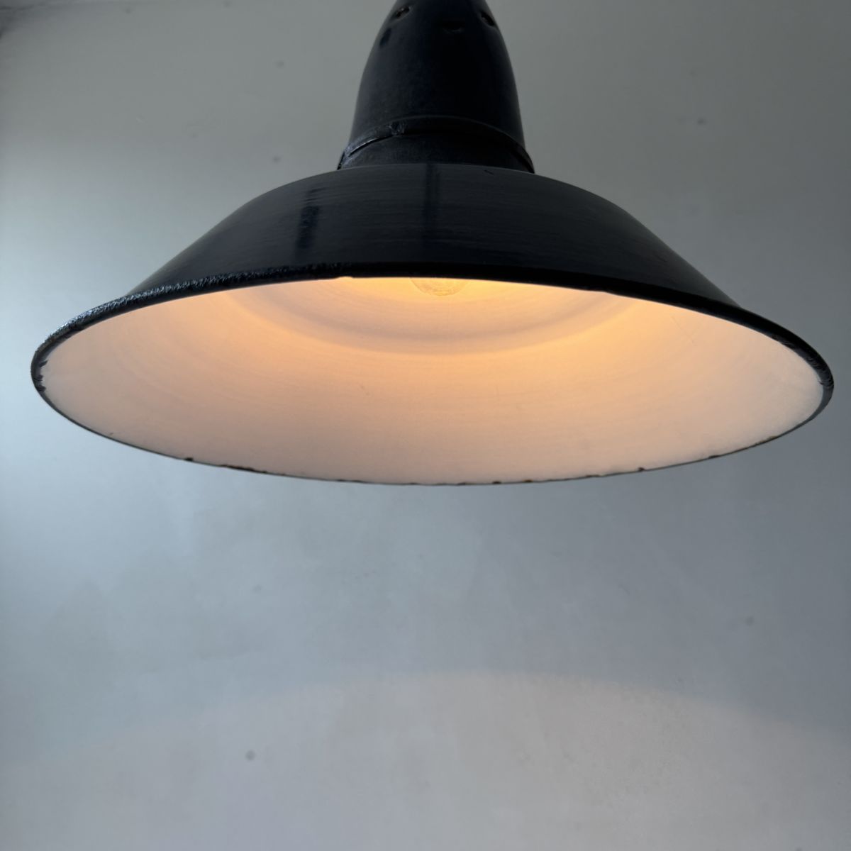 Suspension d’usine en tôle émaillée gris-noir. Des traces de rouilles et sauts d’émail.