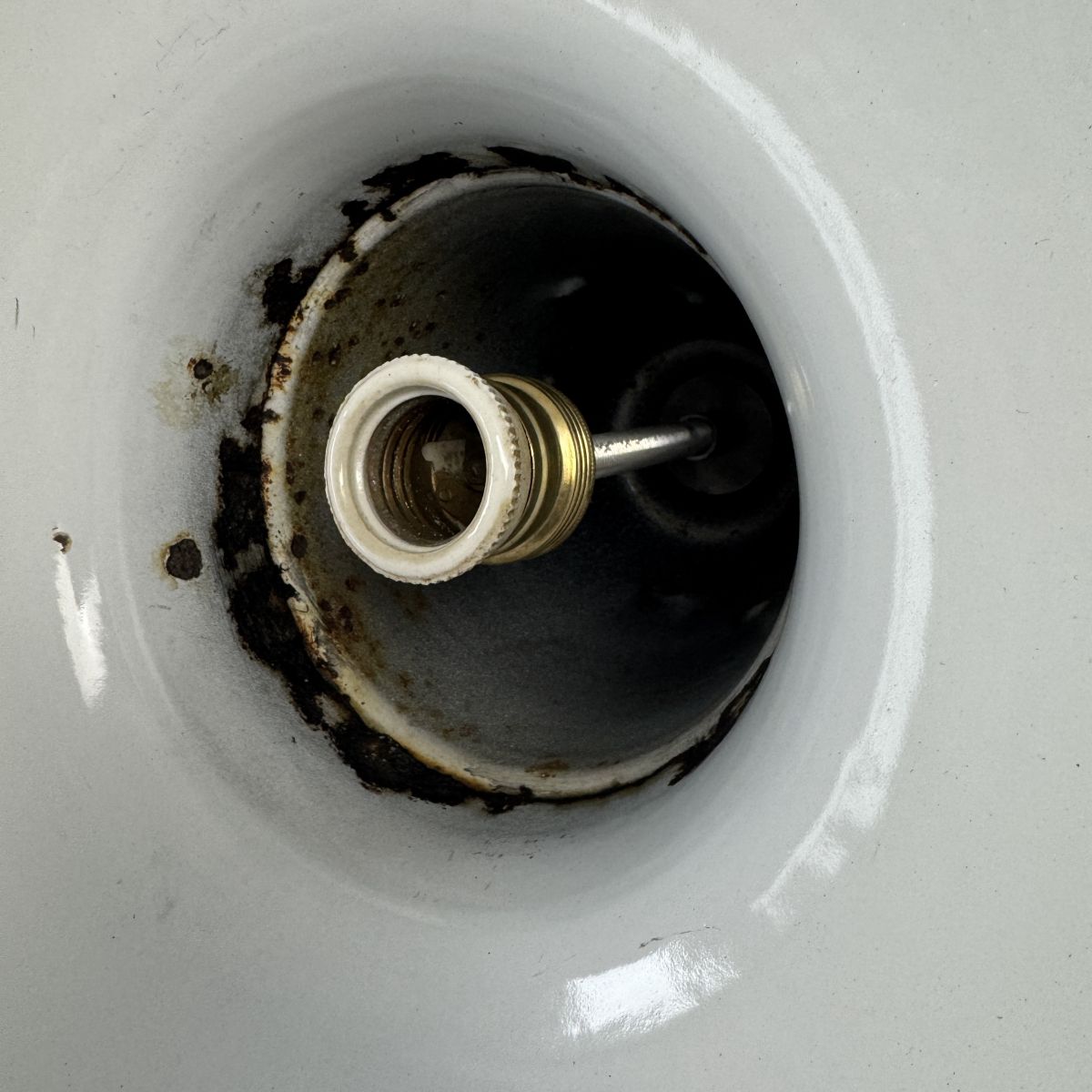 Electricité refaite à neuf avec fil en tissu noir torsadé. Branchement par domino. Douille à vis gros culot (E27). Présence d’une chaine et d’une rosace en porcelaine pour accroche au plafond.
