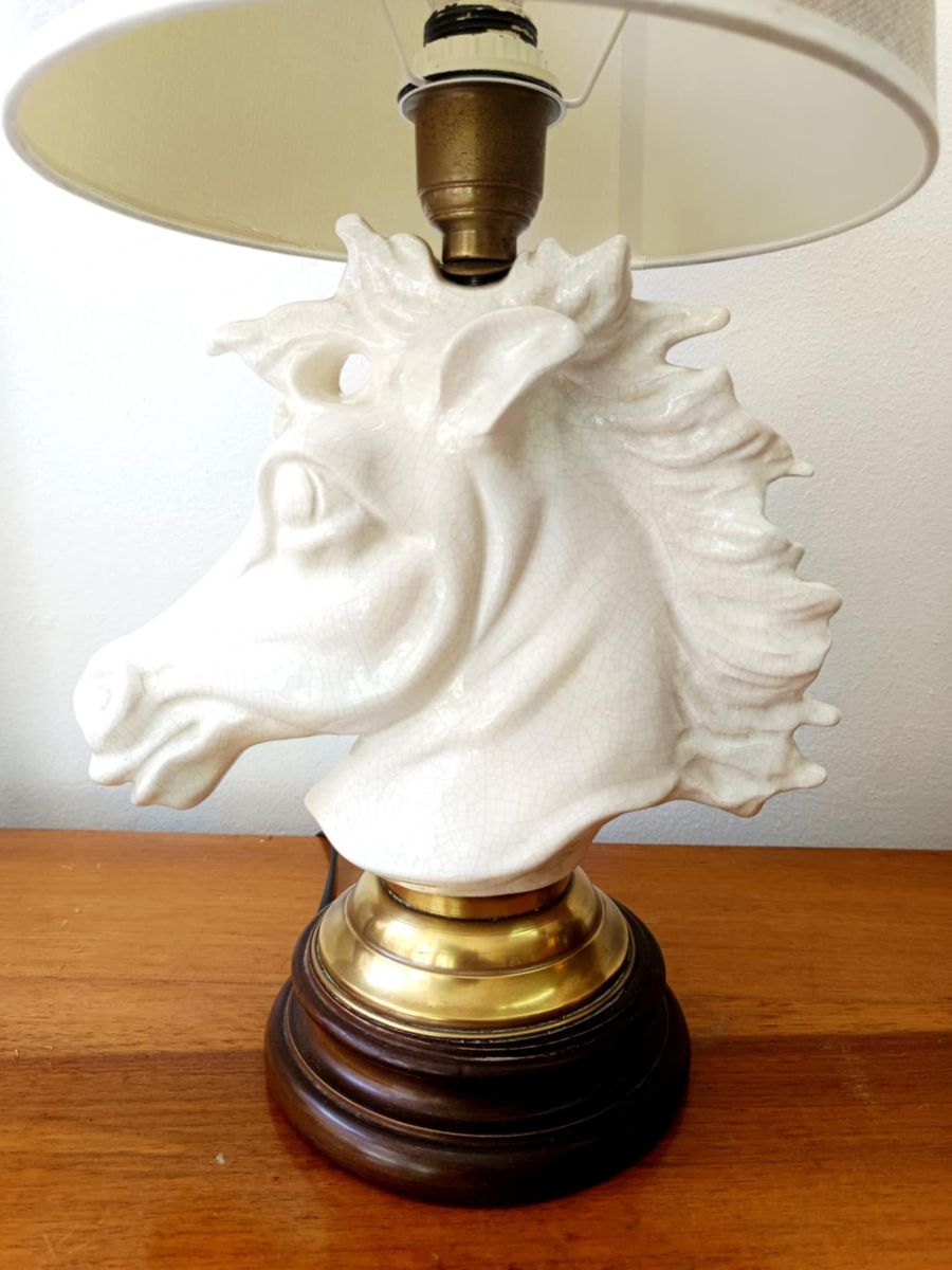 Pied de lampe composée d'une tête de cheval en céramique beige craquelée, montée en lampe sur un pied rond en bois tourné et laiton doré. Abat-jour beige à bordures.
