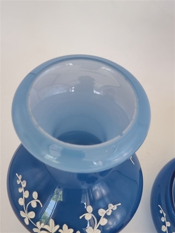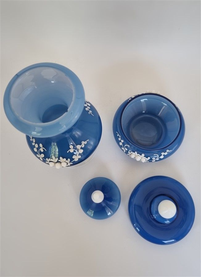 Accessoires de toilette en opaline bleue, un pot d'apothicaire et une boîte.
