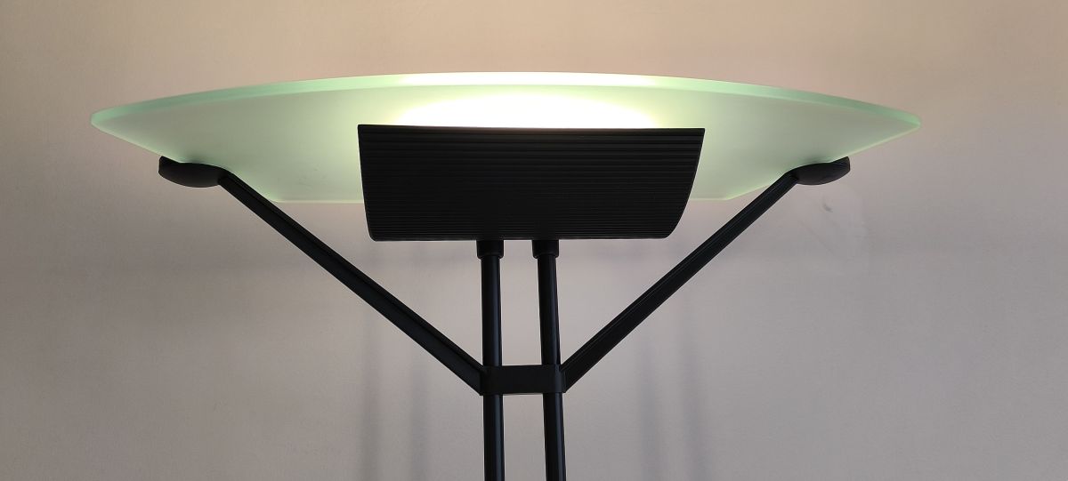 Structure en métal laqué, base plastique et abat-jour en verre satiné, en excellent état, rien à signaler que ce soit sur l’esthétique ou le fonctionnement, signé LUCITALIA sur le dessus du pied + plaque d’identification d’origine en dessous.