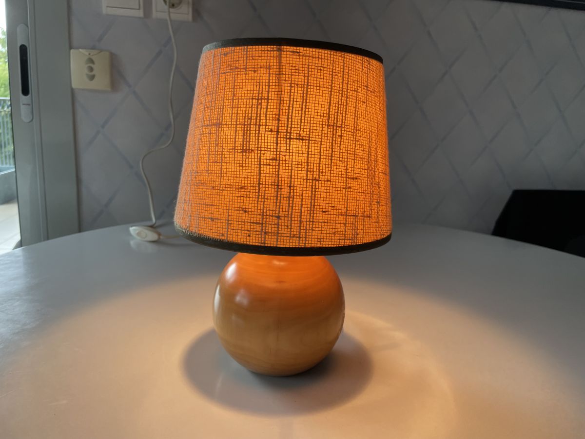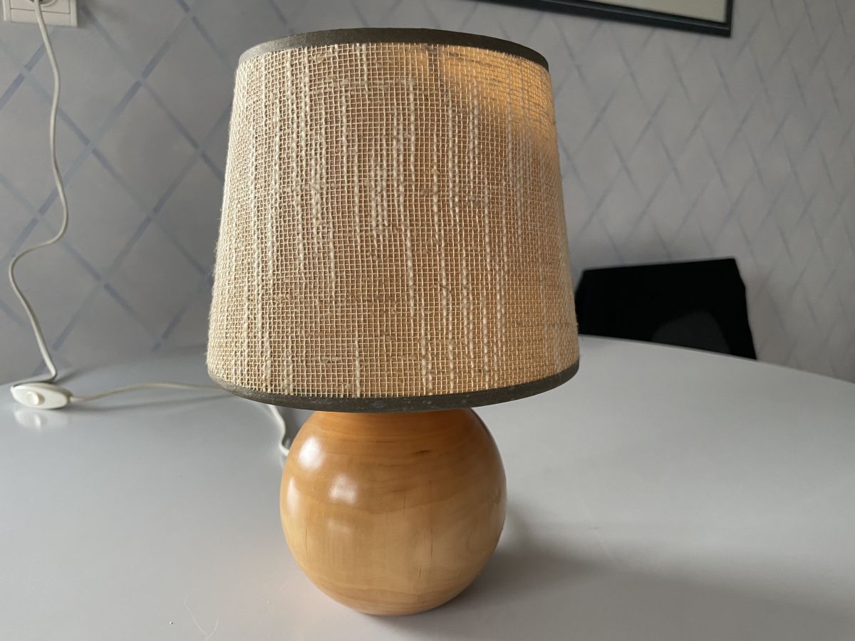 Lampe boule à poser en bois clair massif, fabrication française (Metropolight à Epinal), abat-jour en tissu et toile de jute, fonctionne parfaitement, superbe lumière chaude, diamètre 11cm, hauteur 24cm, bon état général.