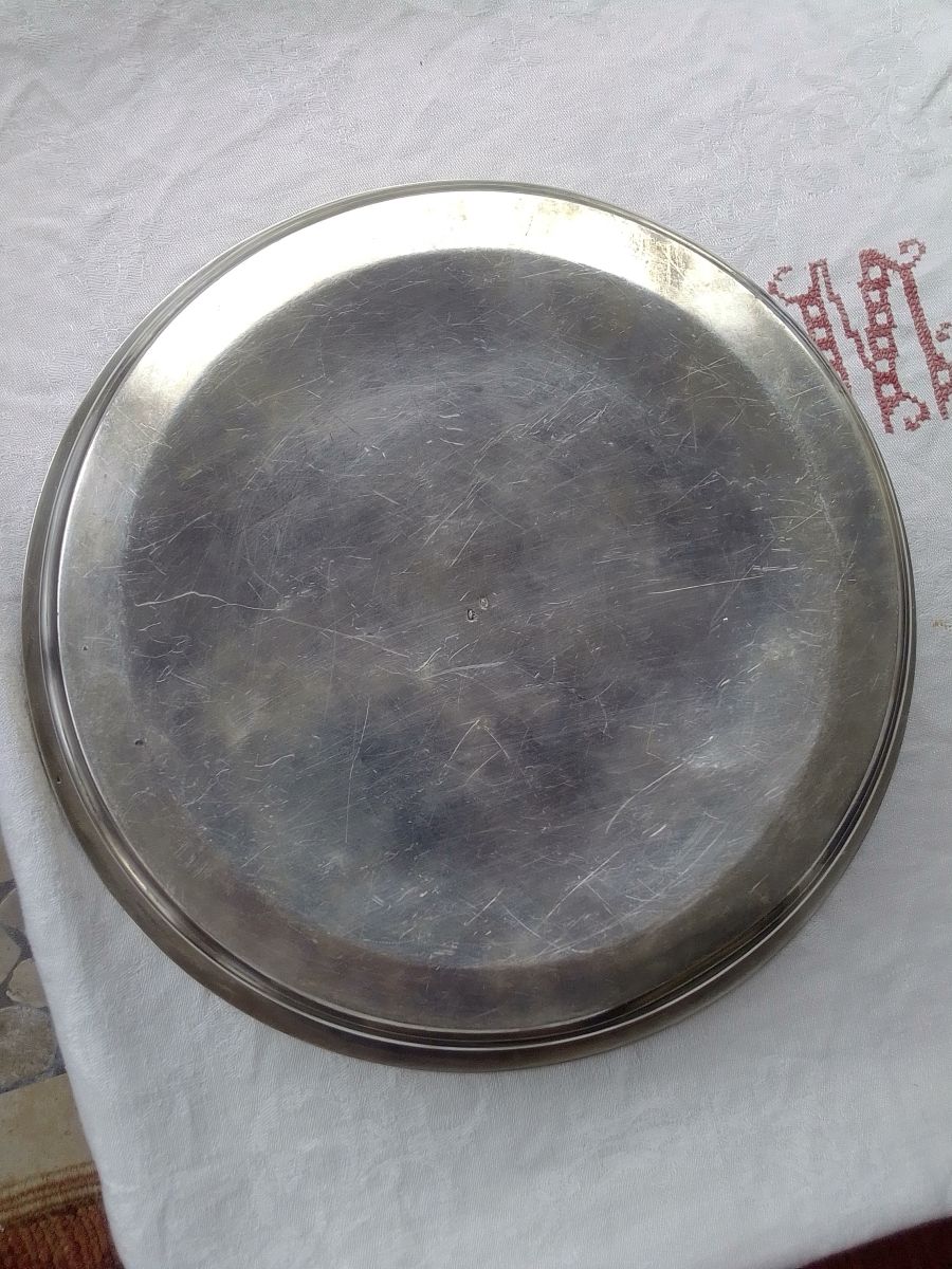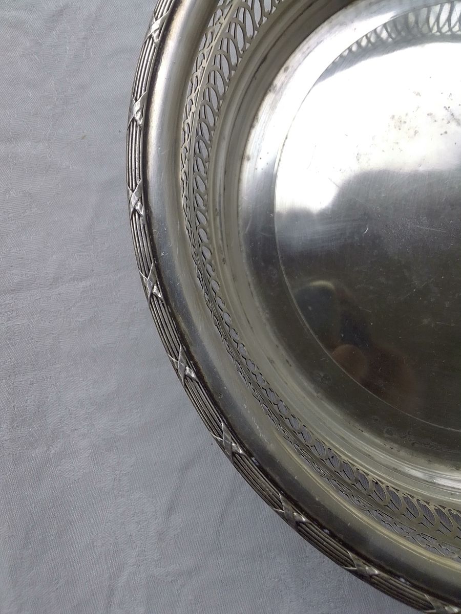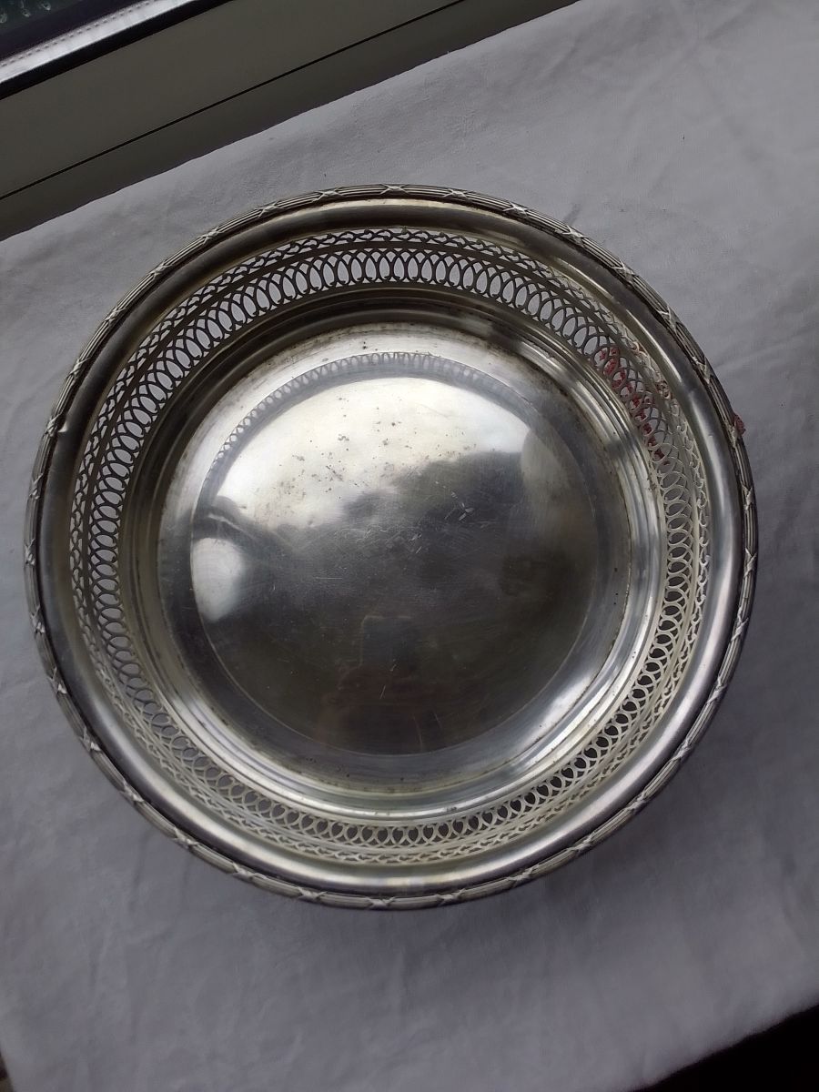 Jolie corbeille en métal argenté ajourée décor rubans croisés sur le bord