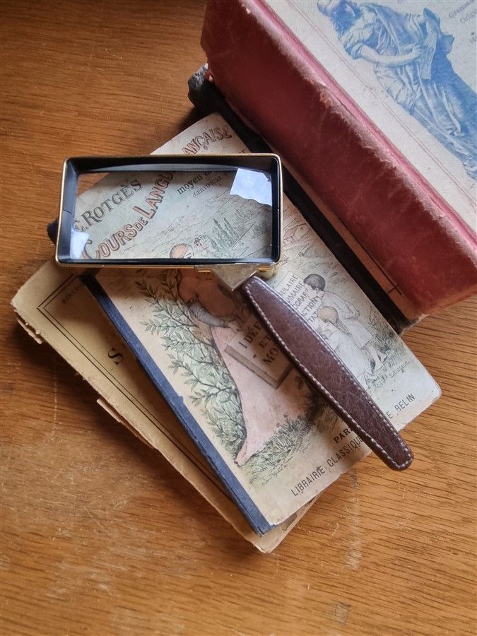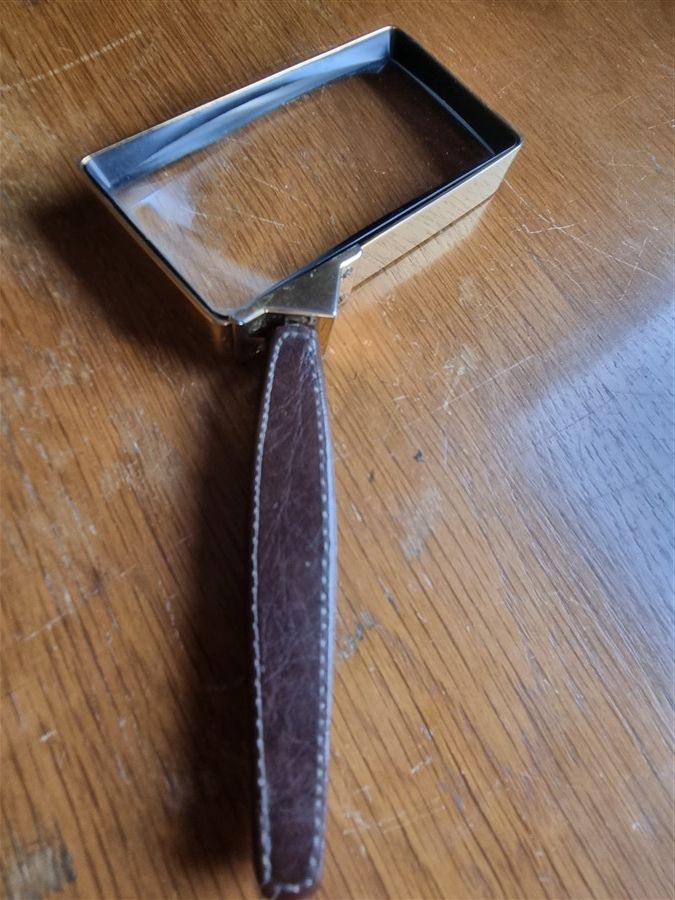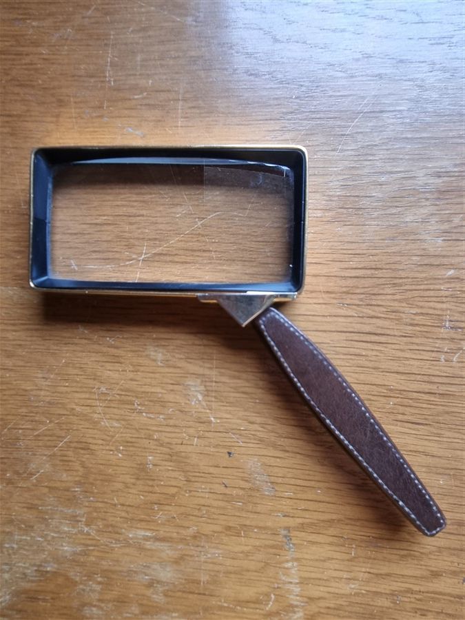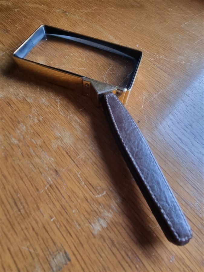 Loupe vintage rectangulaire, contour en laiton, manche en cuir.