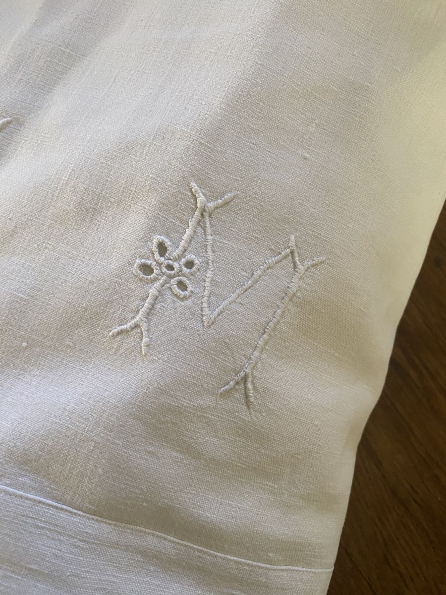 Grand drap blanc de trousseau en coton des annees 50.Monogramme À M.Simple et raffiné !