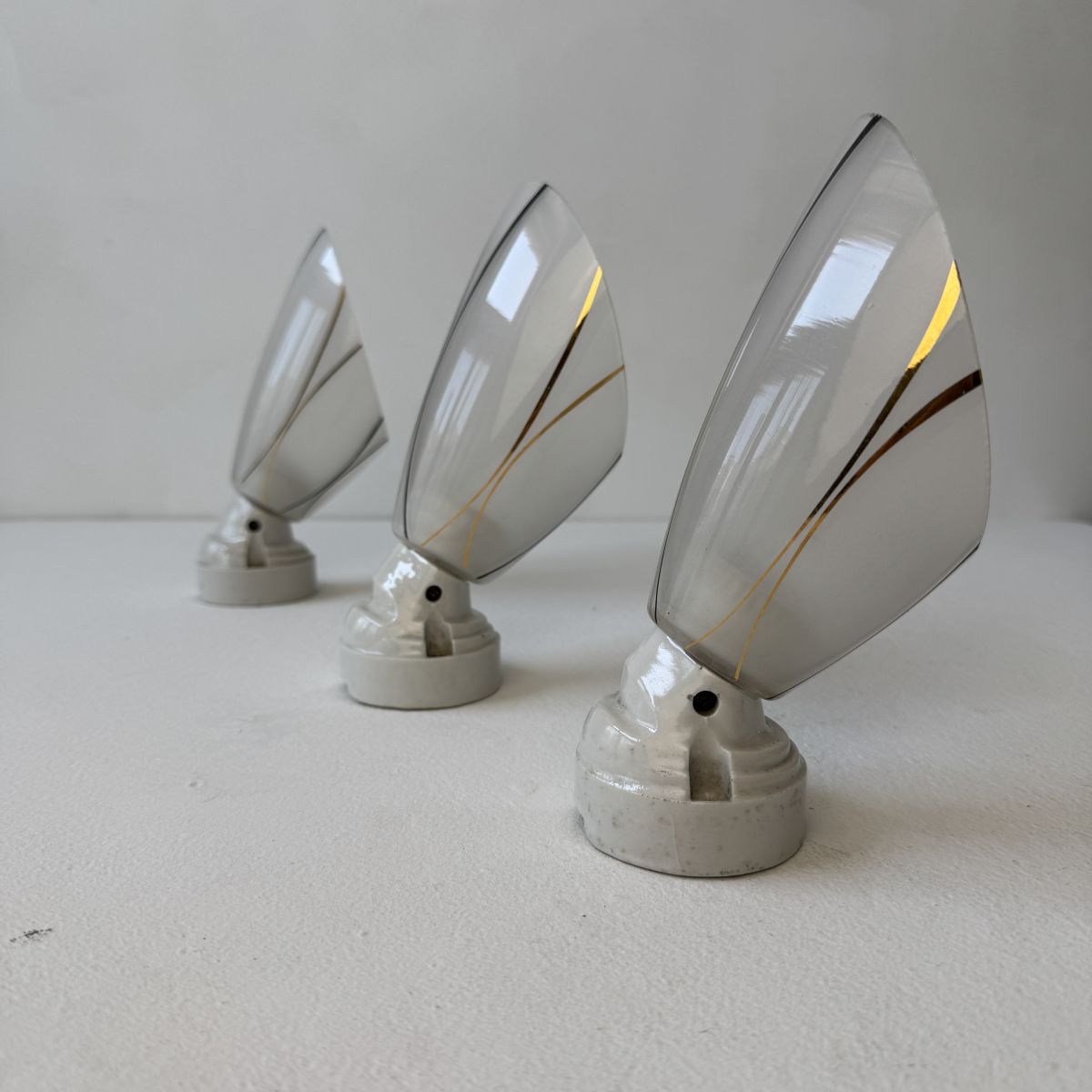 Lot de 3 appliques vintage en céramique et abat-jours en verre décoré. Année 1950