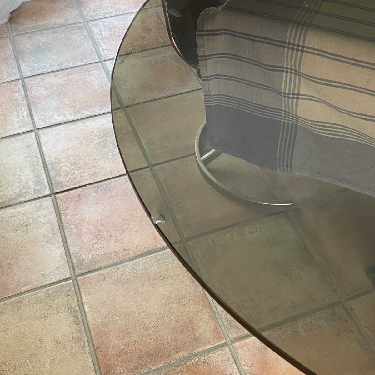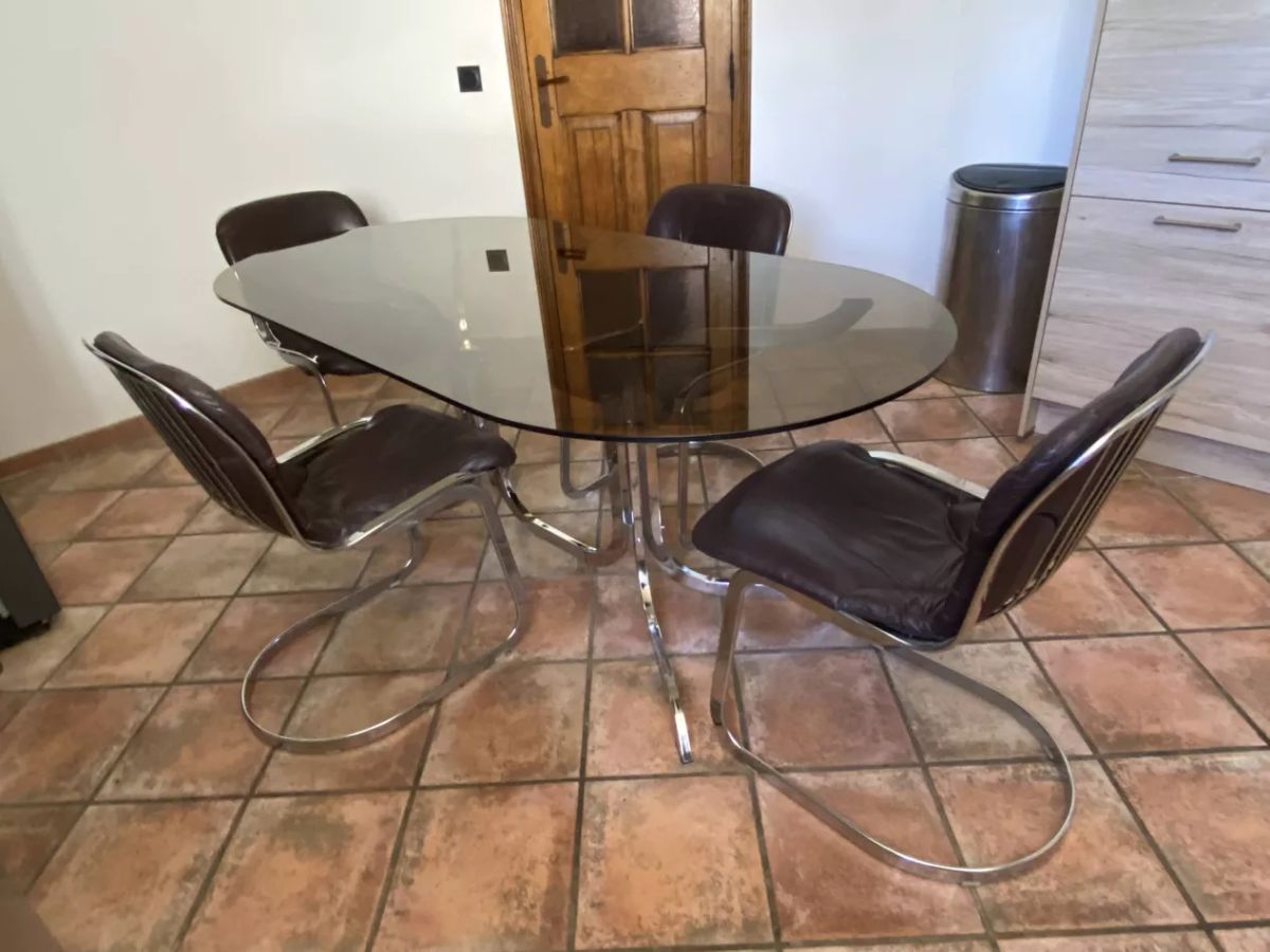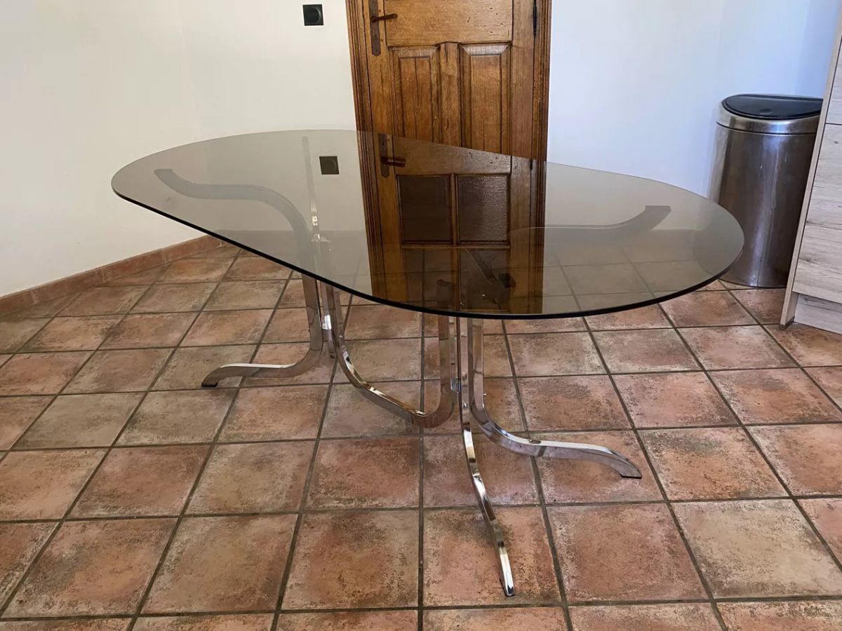 Piètement tubulaire arqué en acier chromé. Plateau ovale d’origine en verre fumé.