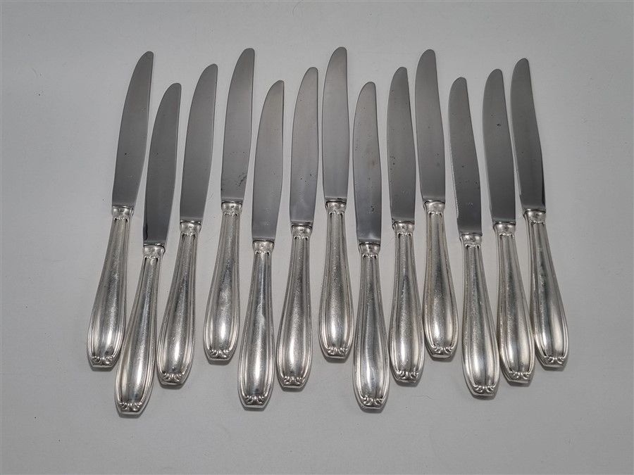 13 couteaux de table aux lames en inox et aux manches en métal argenté.