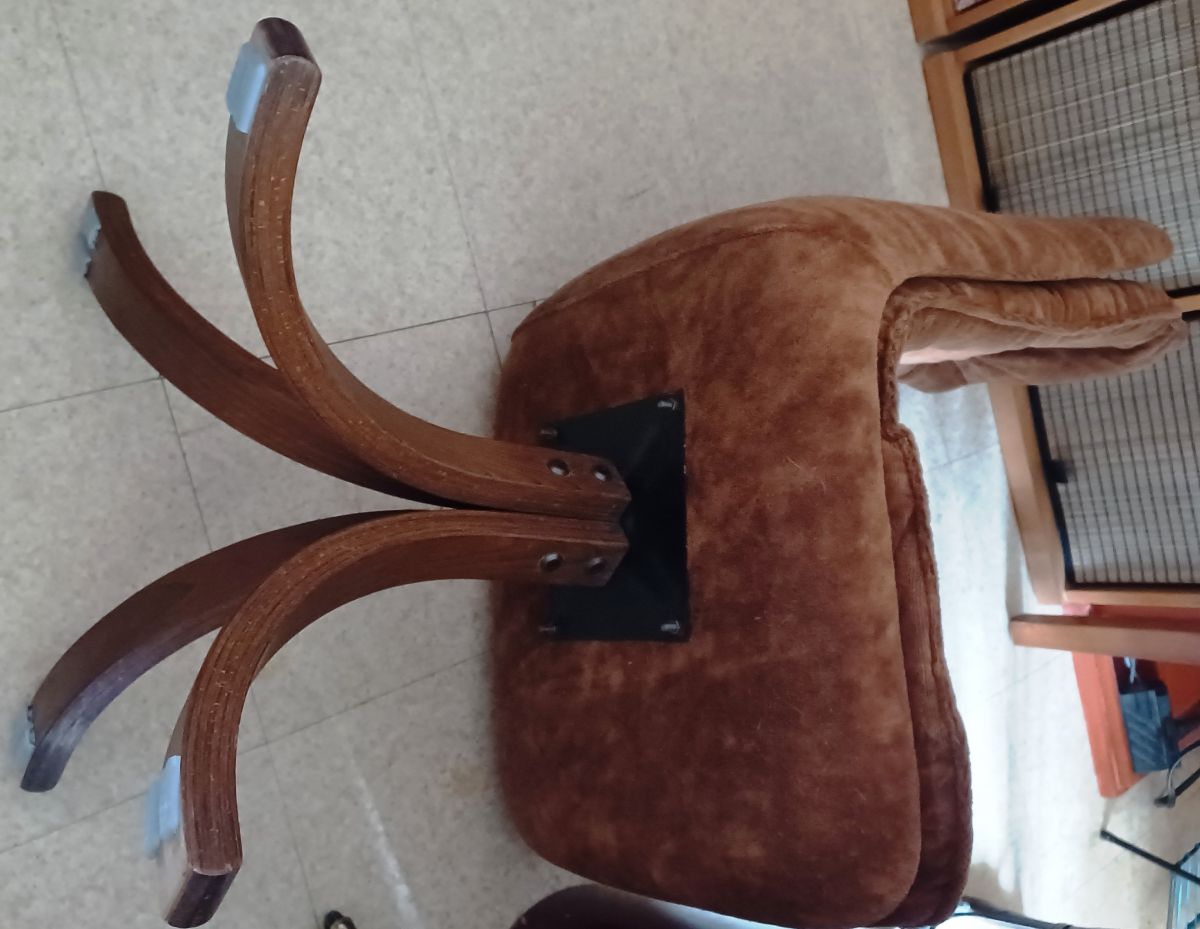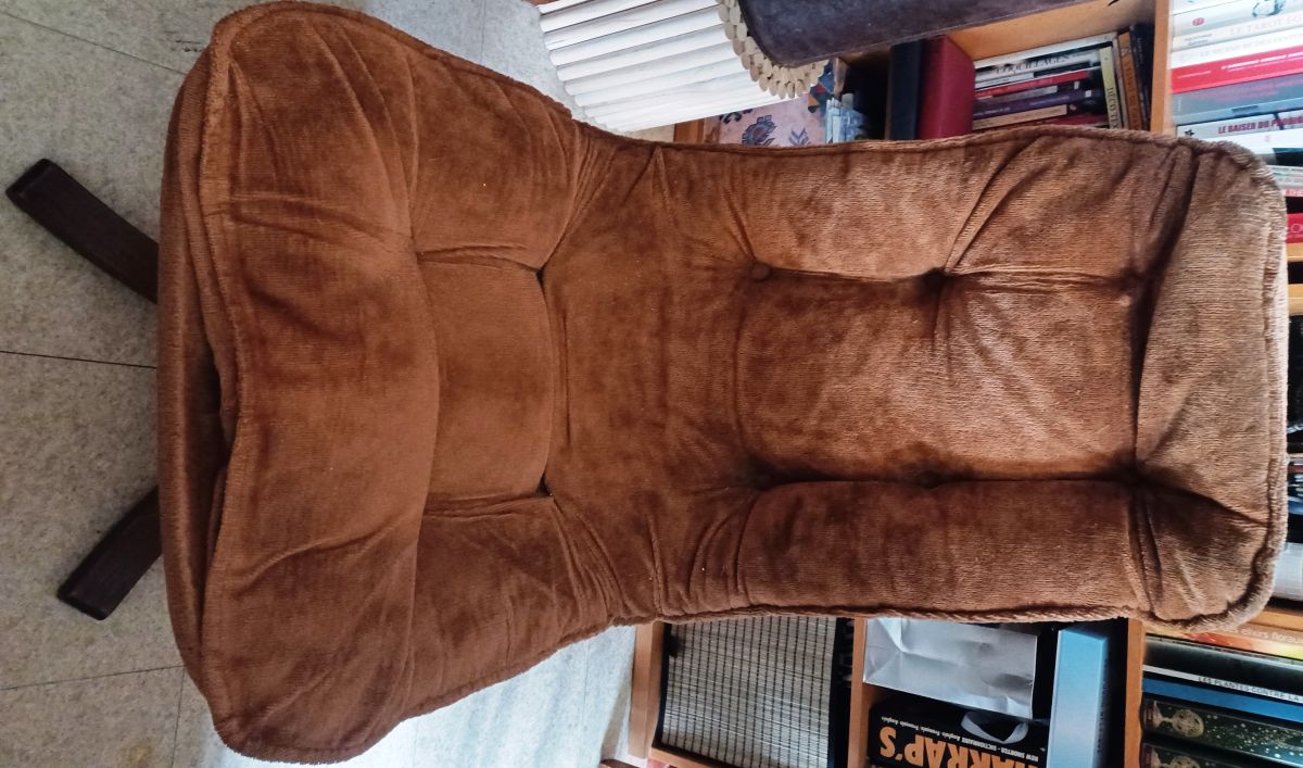Chaise ou fauteuil pivotant, confortable, sur pieds en bois. Peut s'installer dans un salon, dans un bureau, dans une chambre. Solide et vintage, le velours est abîmé par endroit en raison de son âge, d'une part, et de griffures de chats, d'autre part. Mais ce fauteuil est quand même visuellement très beau et utilisable en l'état sans souci. Dimensions: profondeur assise 36 cm ; hauteur dossier 53 cm ; hauteur totale 91 cm ; largeur dos 40 cm ; largeur siège 49 cm au plus large ; Vente en raison d'un prochain déménagement, je ne peux malheureusement pas le garder. PRIX : 25 EUROS. Pas de livraison. A venir chercher ou bien je peux l'apporter si pas très loin.