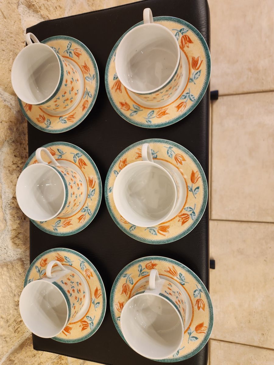 Offrez à votre table une touche de charme rétro avec ce magnifique ensemble de 6 tasses et soucoupes assorties signées.