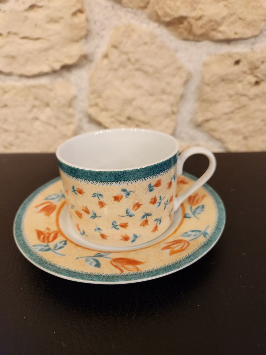 Chaque pièce arbore un délicat motif floral aux tons orangés, bleus et verts sur fond crème, bordé d'un élégant liséré vert. Un design raffiné qui évoque la douceur des années 1990, parfait pour les amateurs de vaisselle décorative ou les collectionneurs.