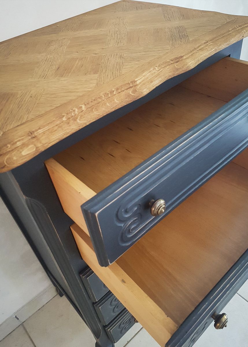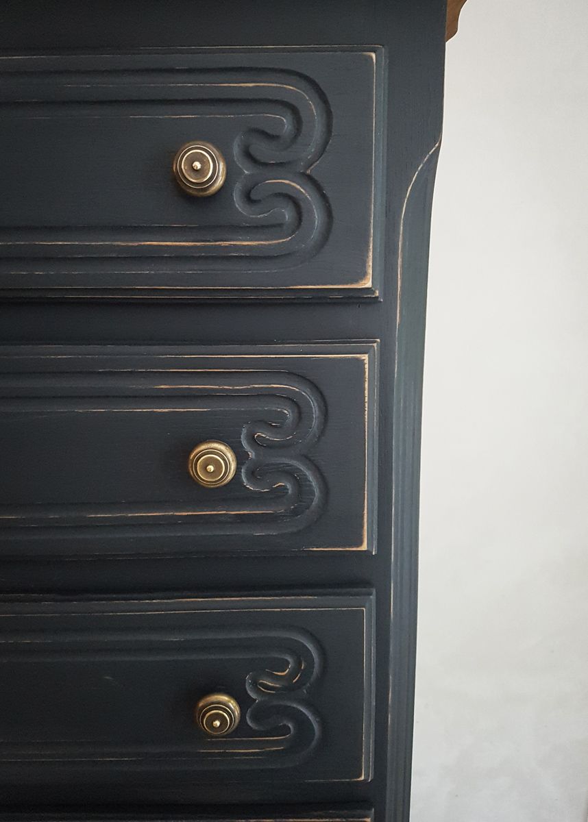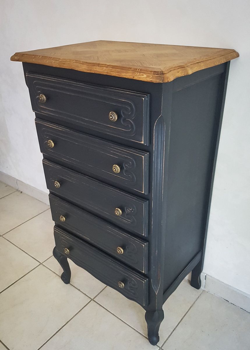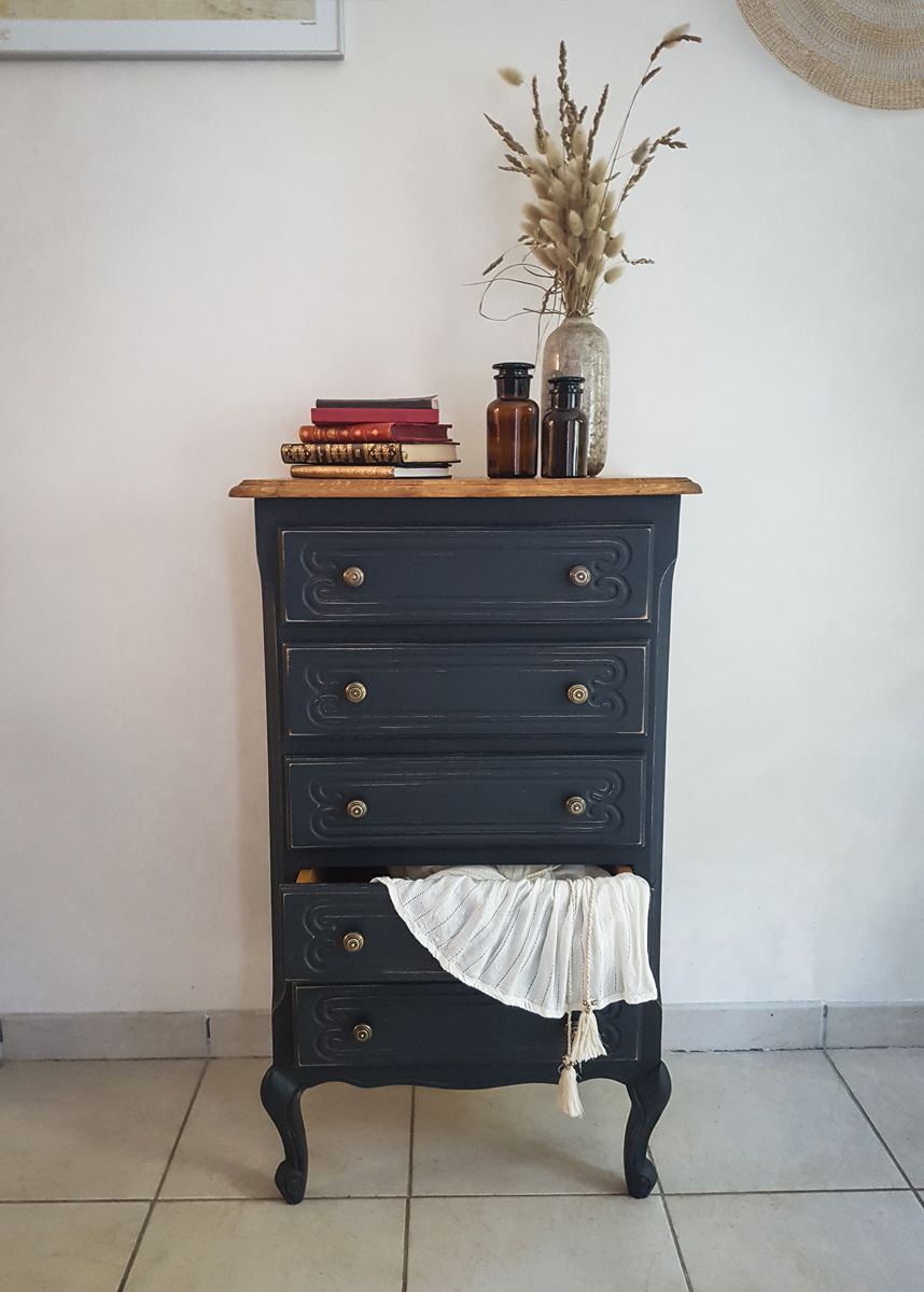Élégant chiffonnier vintage rénové, dans une subtile nuance de noir, qui trouvera aisément une place dans une chambre, un salon, une entrée