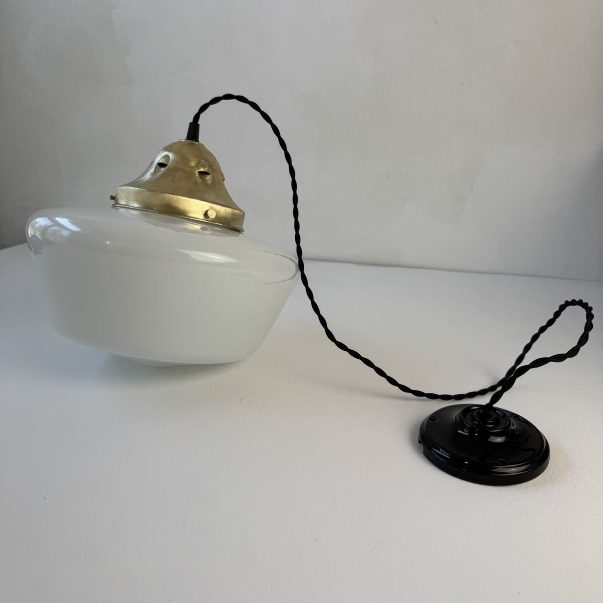Electricité refaite à neuf avec fil noir en tissu tressé. Prête à brancher par domino. Douille à vis gros culot en Bakélite (Ampoules E27). Rosace en porcelaine pour accroche au plafond.