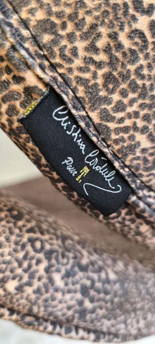 Le revêtement est en velours chiné léopard, les pieds sont en métal laqué noir.