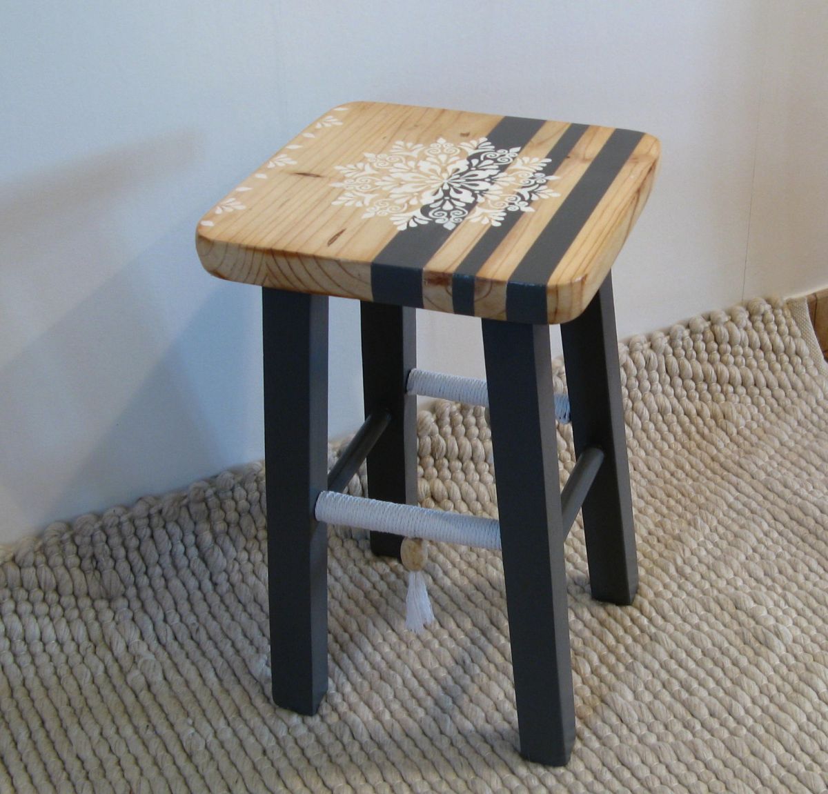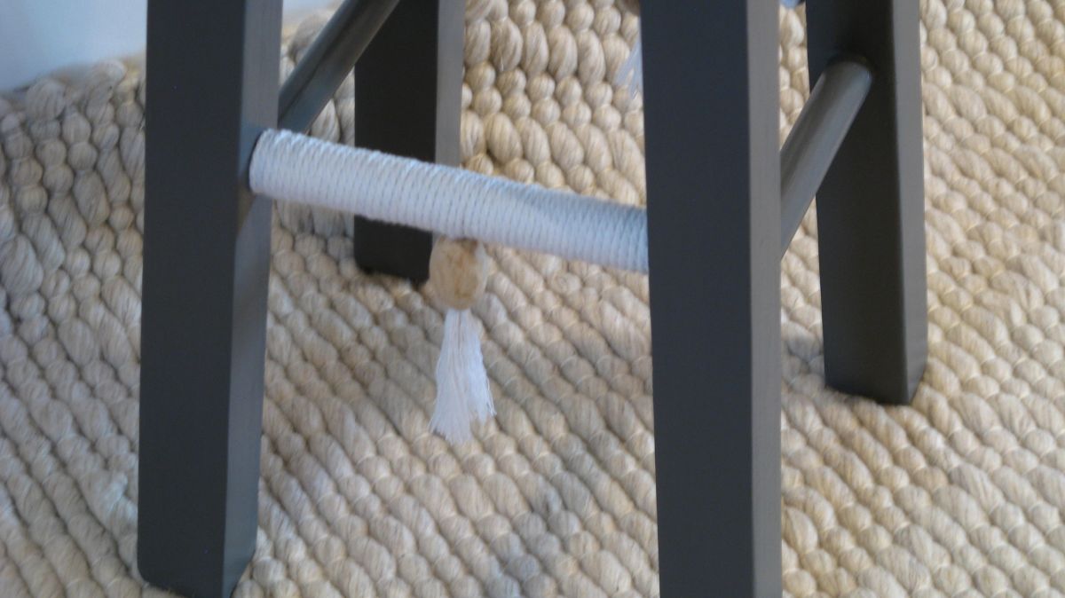 L'assise est restée en bois brut. Elle a été habillée de rayures gris foncé et d'un joli motif blanc.