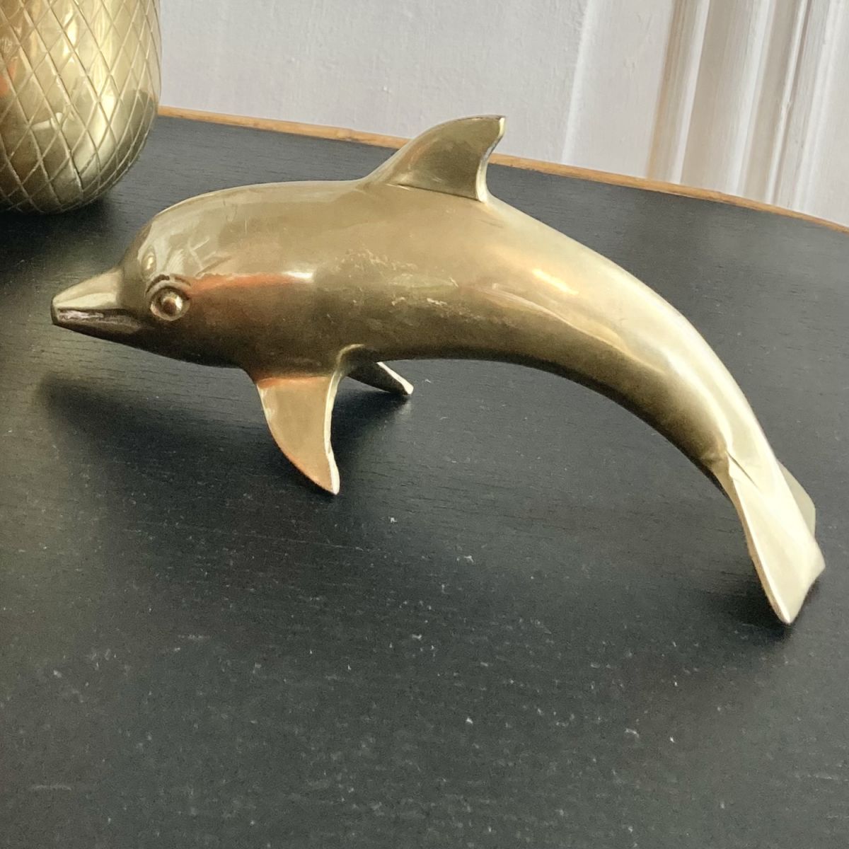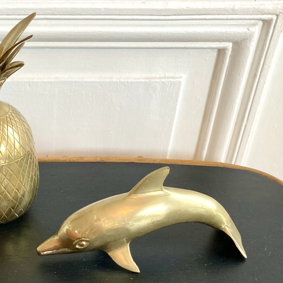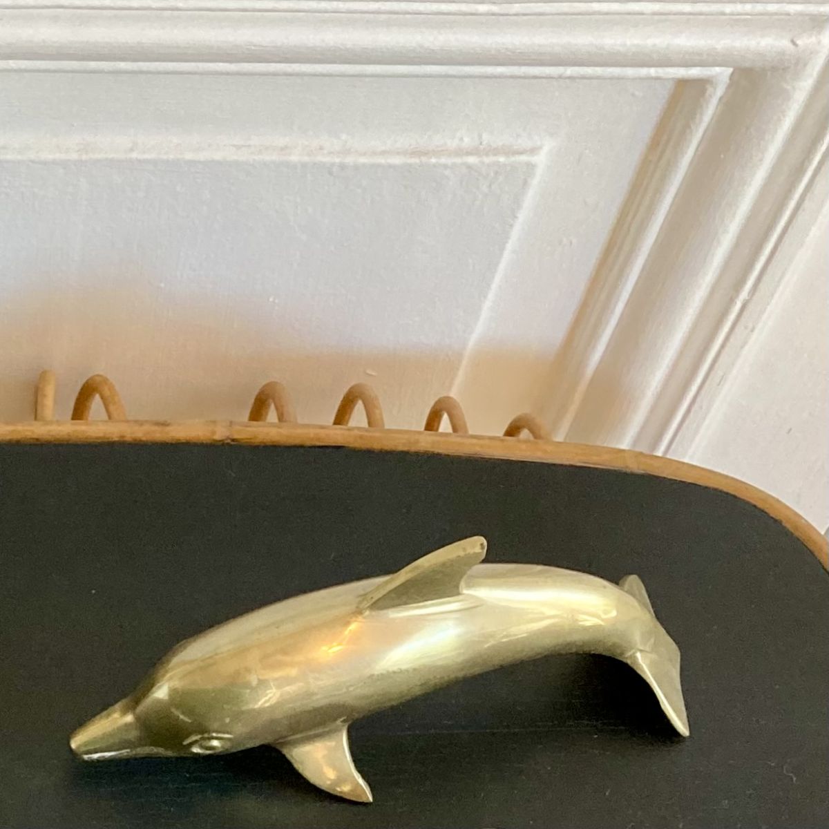 Grand dauphin en laiton des années 60 à la belle brillance dorée, objet de curiosité ou à détourner en presse-papier.