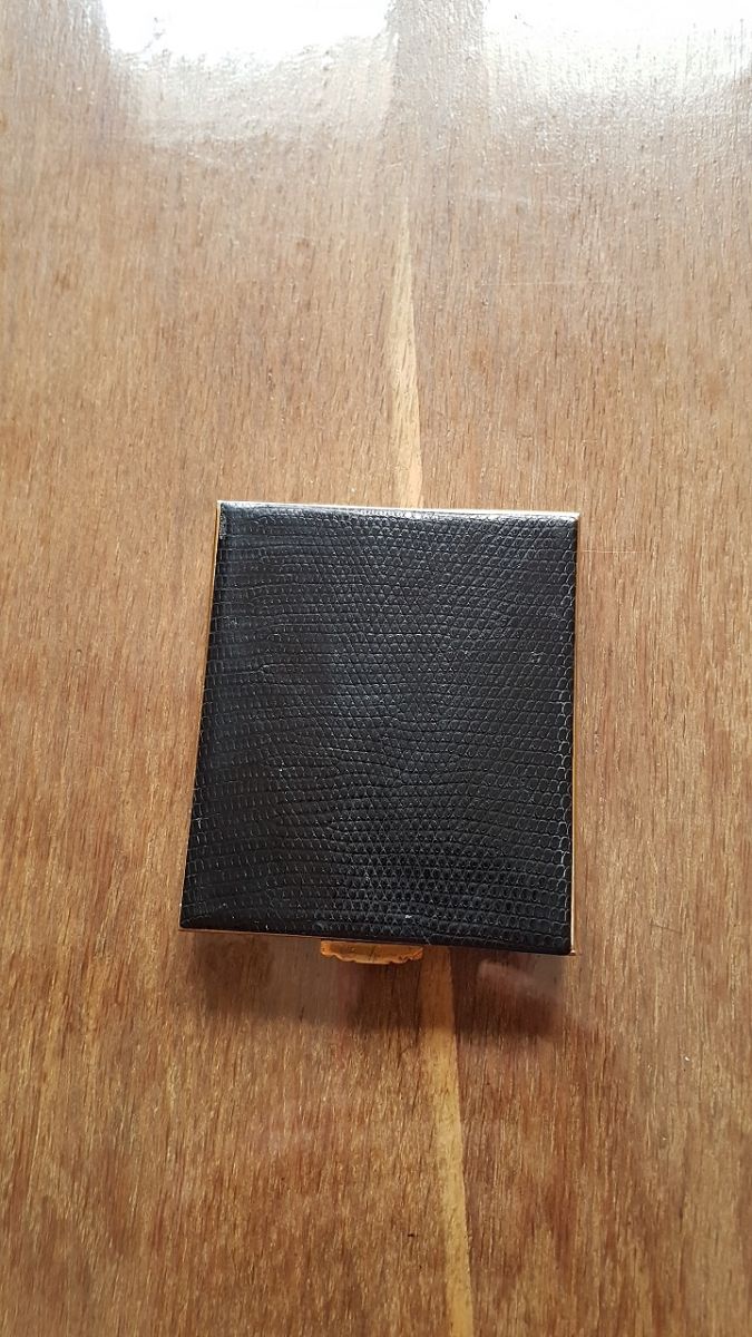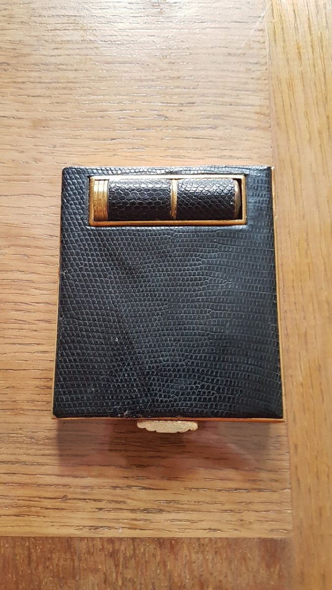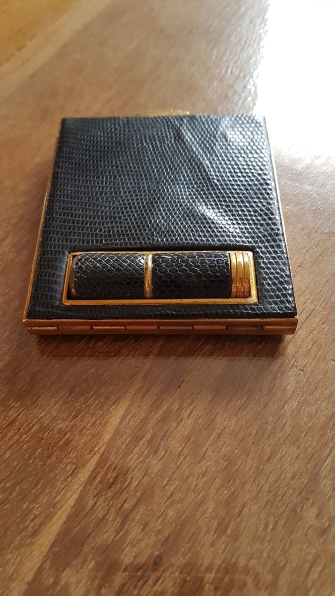 Poudrier avec boîtier rouge à lèvres assorti, en laiton doré recouvert de peau de lézard teintée noir, matériaux utilisés à cette époque.