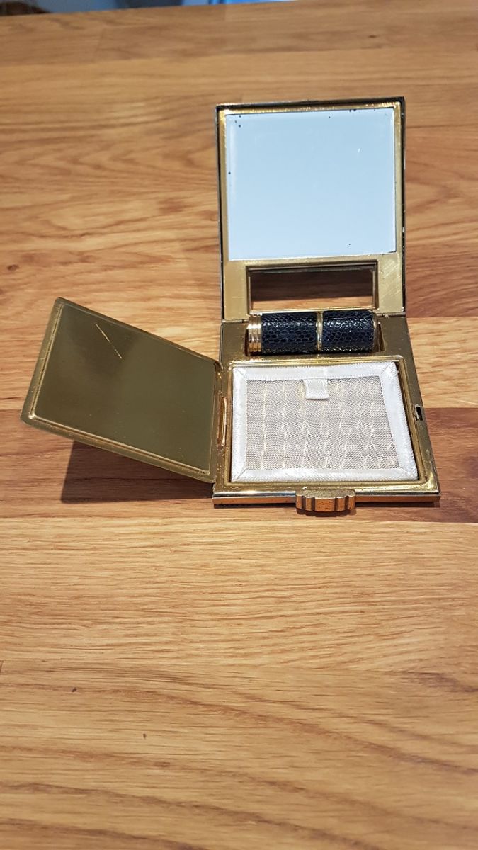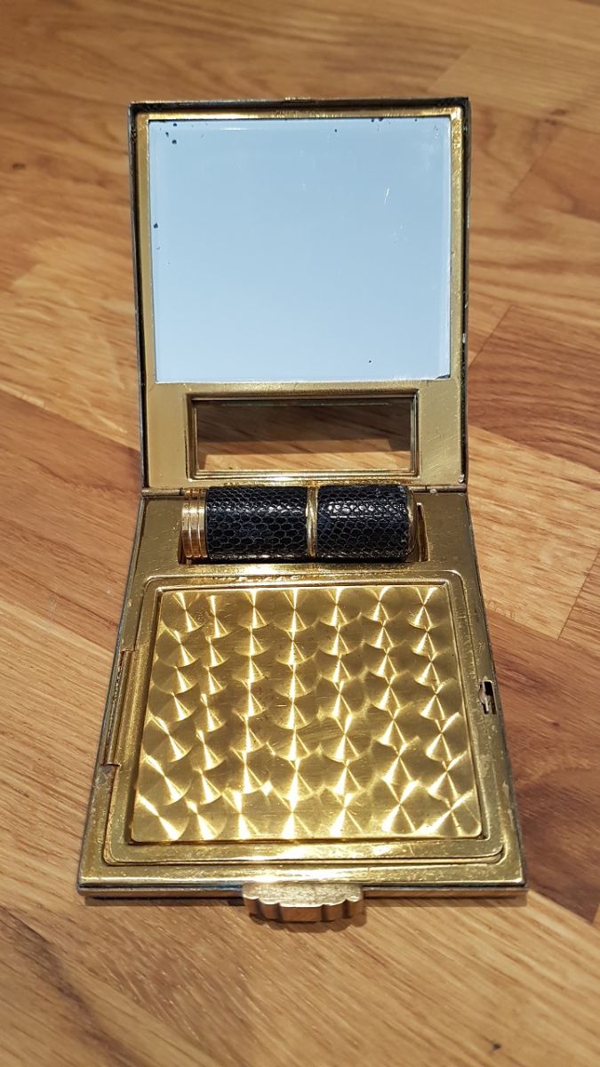 Miroir intérieur, couvercle du bloc poudre, filet de protection poudre, tube de rouge à lèvres, fermoir en très bon état, hormis quelques marques dues au temps.