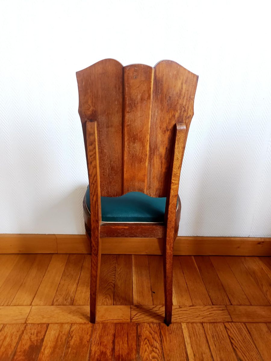 Structure en bois massif, avec dossier plein travaillé en palmettes sur le haut. Assises recouverte d'un cuir vert canard avec une petite bordure beige.