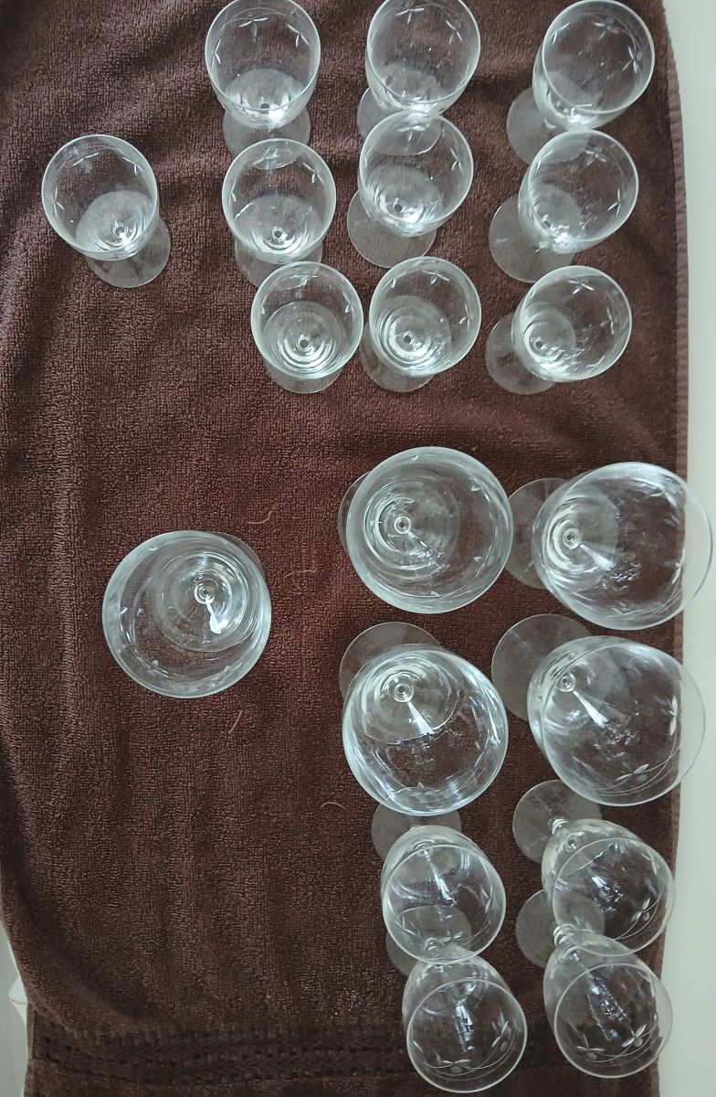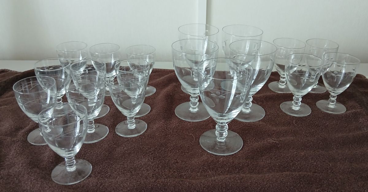 La beauté incomparable du cristal et le charme du vintage ! Lot de 19 verres à pied répartis en 5 grands (pour l'eau), 4 moyens (pour le vin) et 10 petits ( pour apéritif ou digestif).