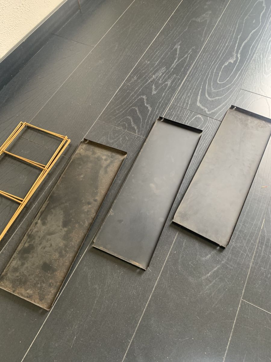 Ancienne étagère string murale (à fixer sur un mur) en métal doré et planches en tôle laquées noire circa 1960 en bon état.