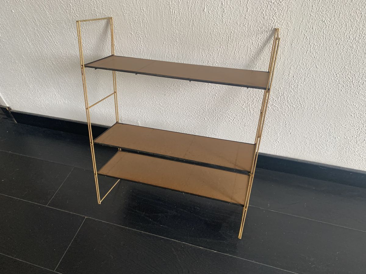 Ancienne étagère string murale (à fixer sur un mur) en métal doré et planches en contreplaqué insérées dans une trame métallique laquée noir circa 1960 en bon état.