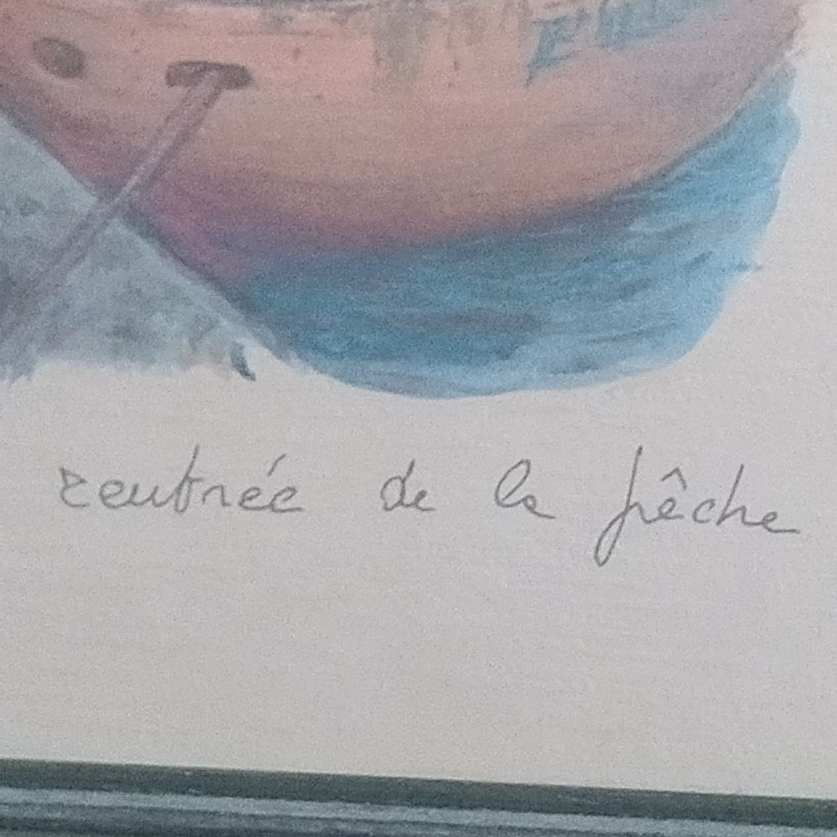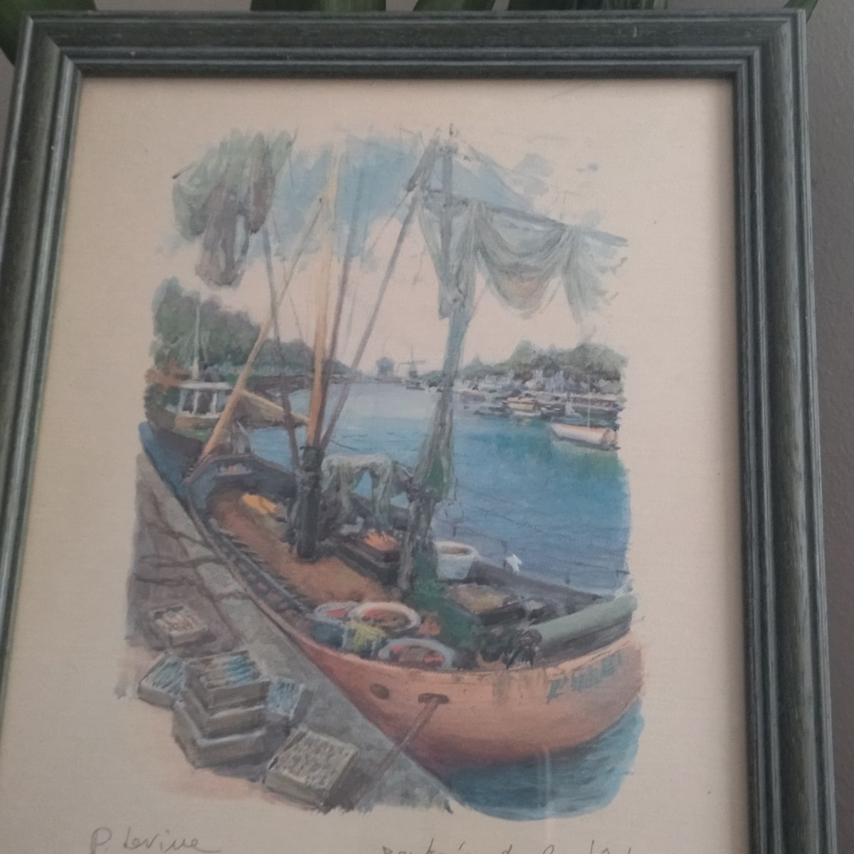 Cette lithographie de Paul Levine, intitulée "Entrée de la pêche", capture une scène pittoresque de bateaux de pêche amarrés. Les couleurs dominantes sont le bleu, le vert et le brun, évoquant une atmosphère maritime sereine. Encadrée sous verre, elle est prête à être accrochée. Un ajout charmant pour tout amateur d'art .