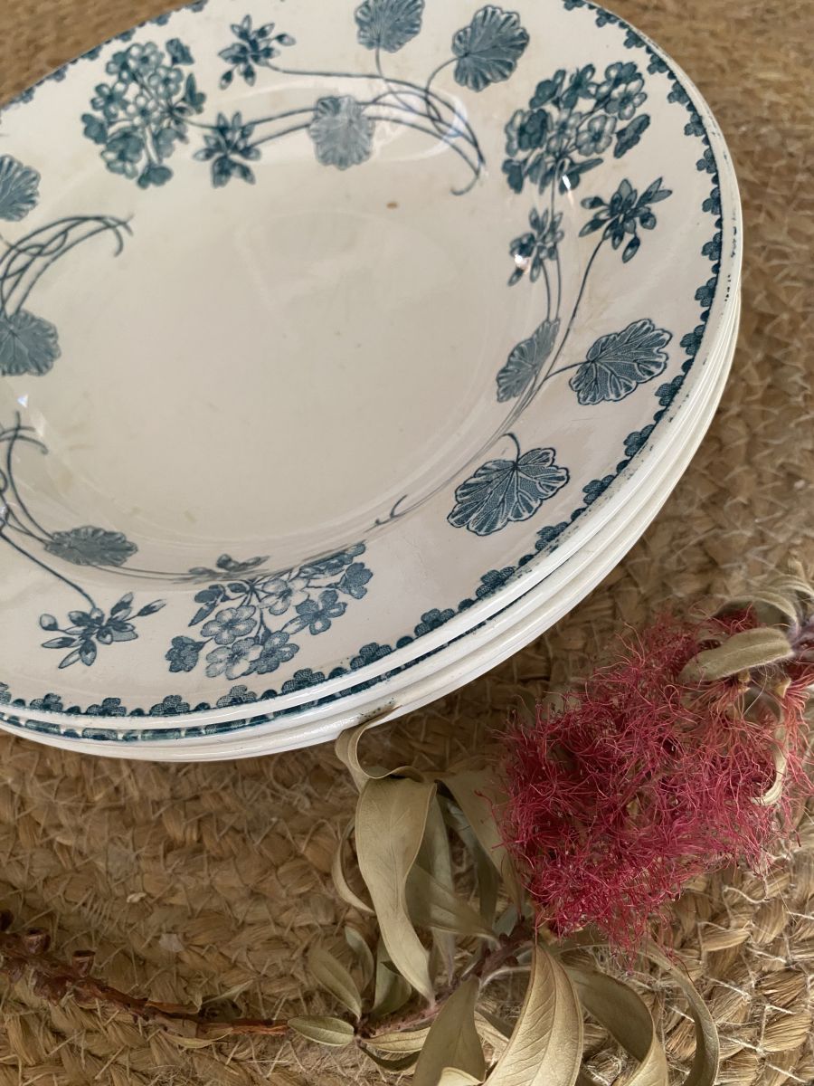 Ensemble 4 assiettes creuses en faïence Sarreguemines U& Cie modele géranium 1900.