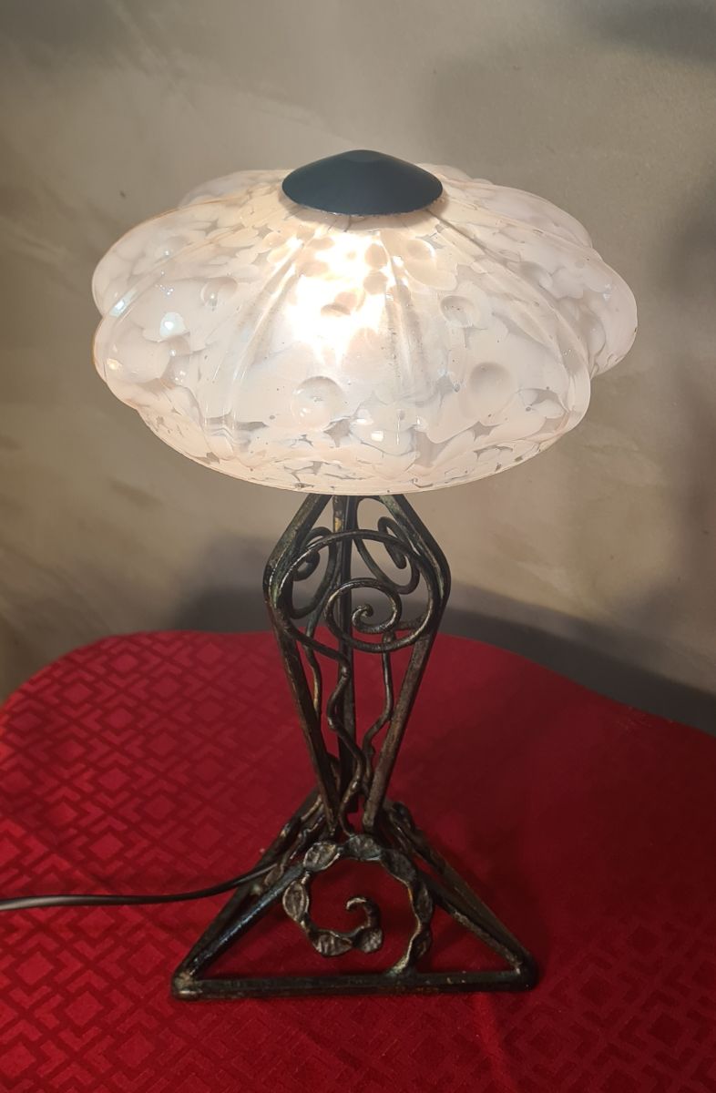 lampe fer forgé 1930 abat jour opaline clichy tres belle 39x