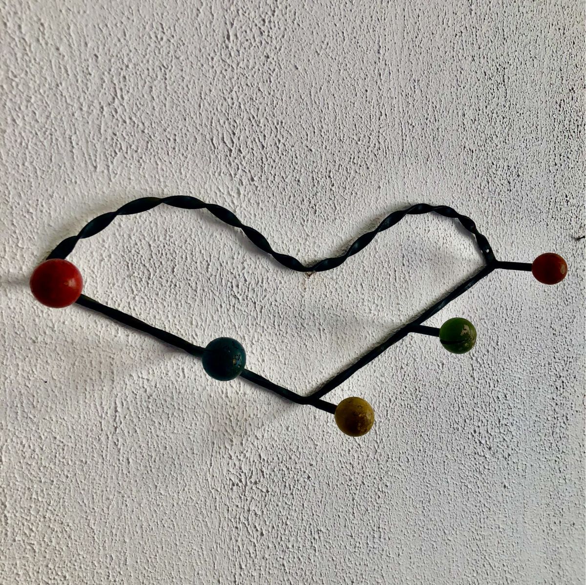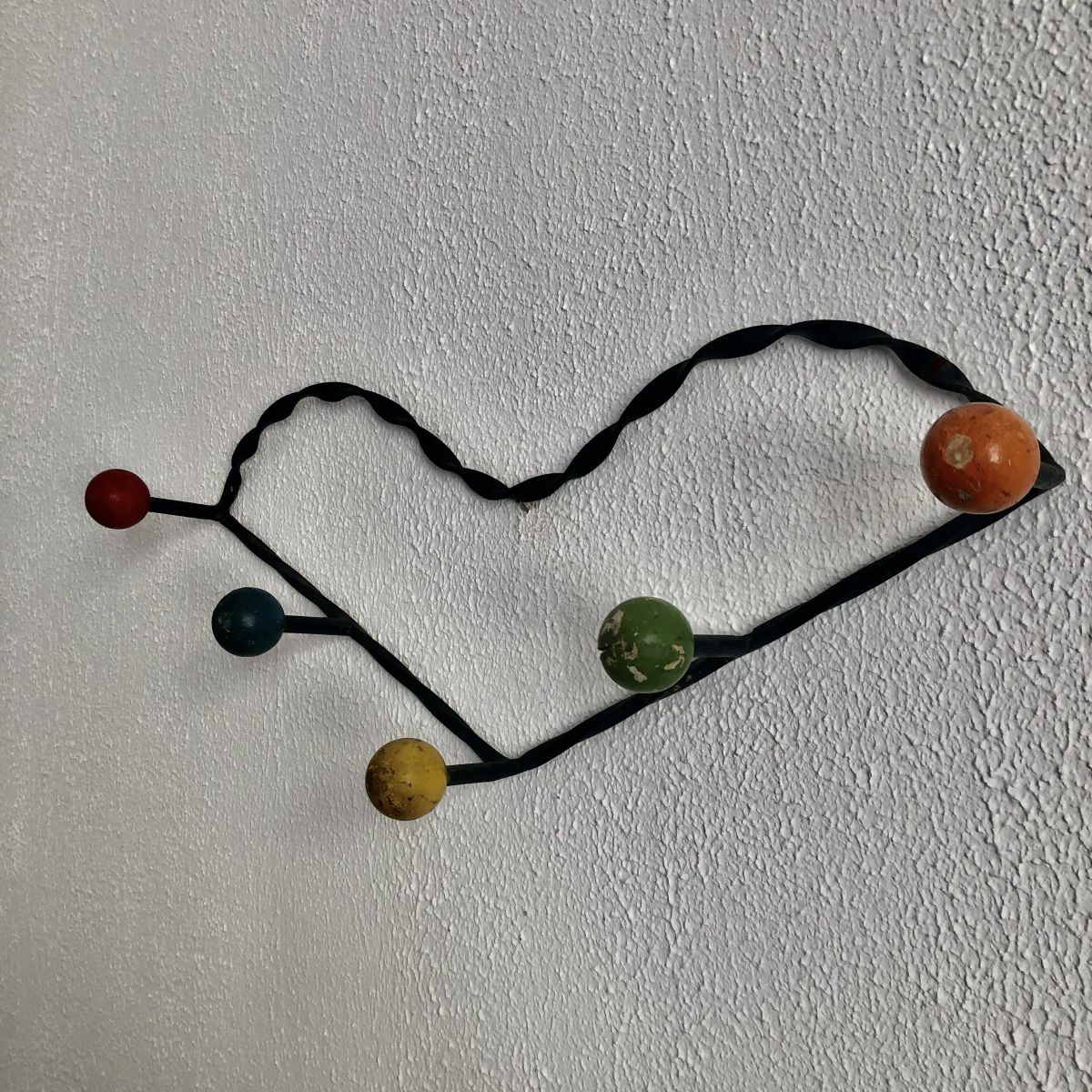 Portemanteau vintage 1960 coeur 5 patères boules bois - 60 c