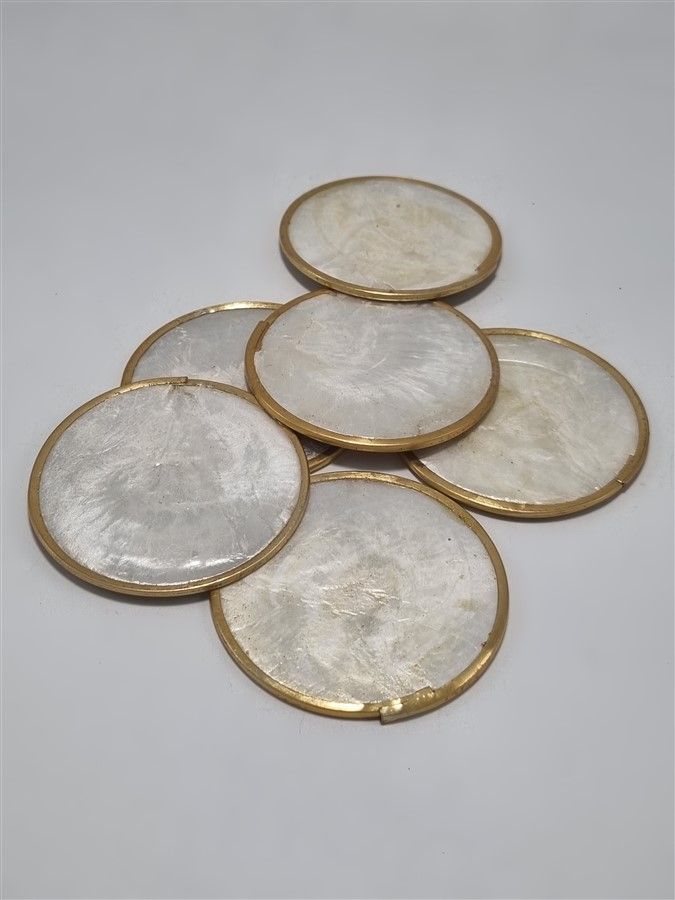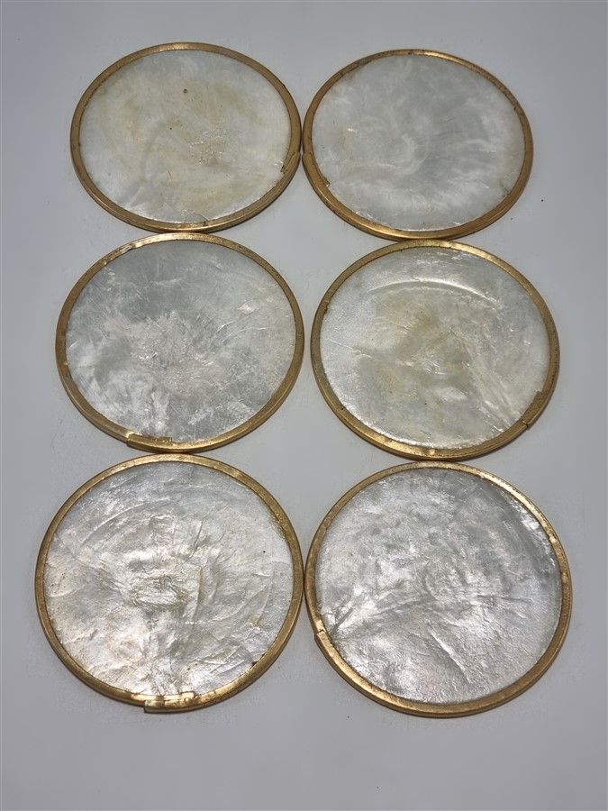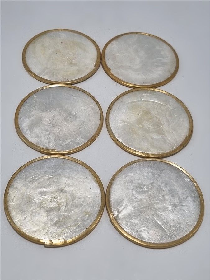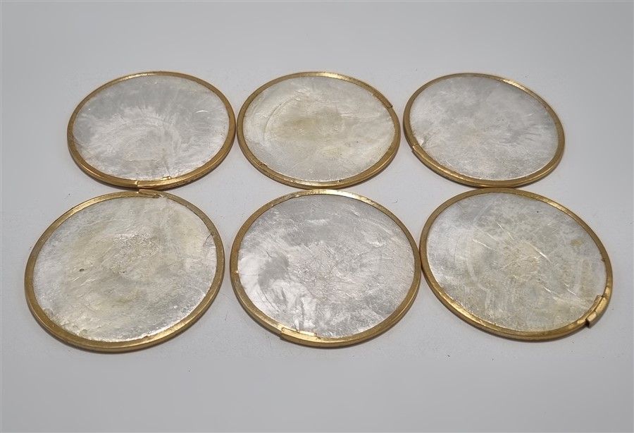 Lot de 6 sous-verre en nacre, 3 sont très clairs, les autres ont une teinte un peu plus jaune.