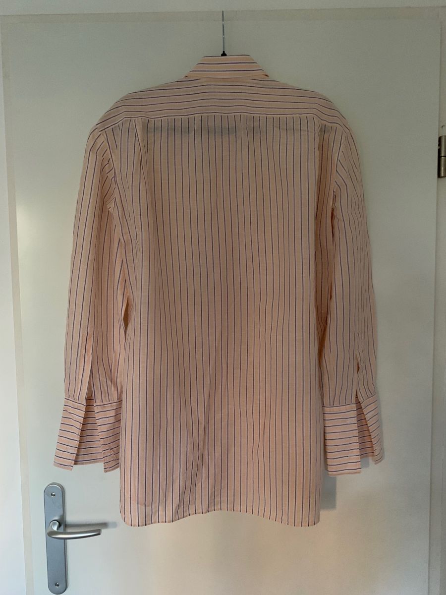 Chemise mousquetaire rose saumon à rayures violettes et blanches