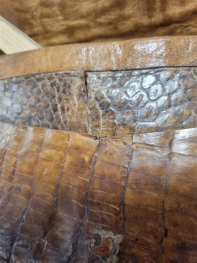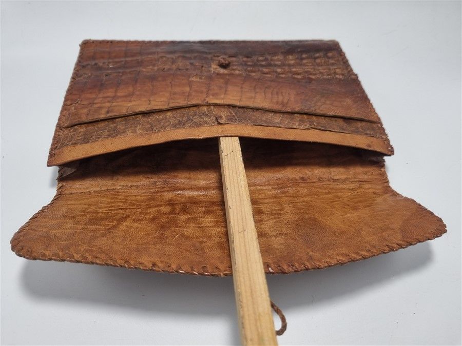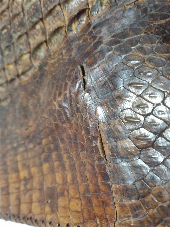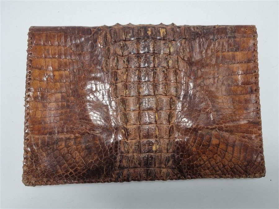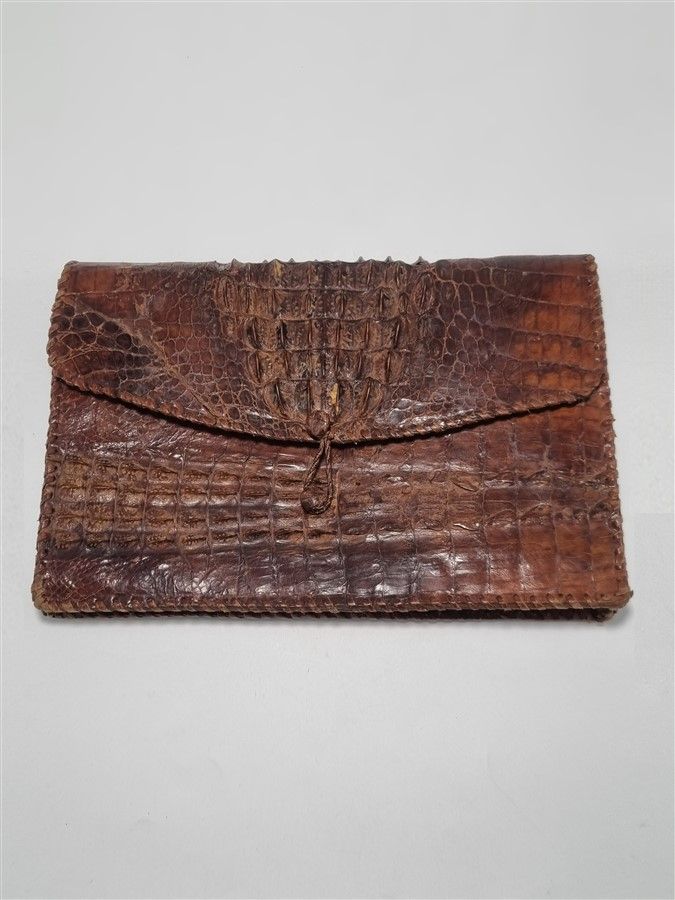 Ancienne pochette en cuir de crocodile, quelques écailles se relèvent un peu mais son état général est bon.